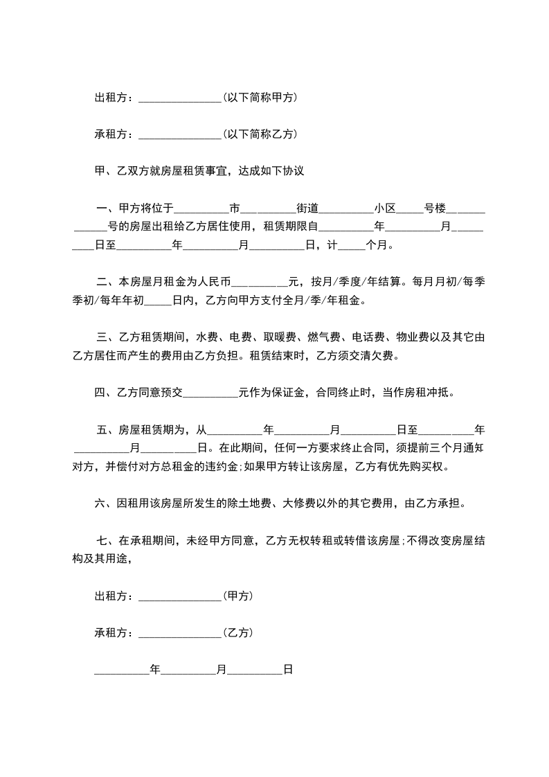 一、甲方将位于__________市__________街道__________小区_____号楼_____________号的房屋出租给乙方居住使用,租赁期限自__________年__________月__________日至__________年__________月__________日,计_____个月。