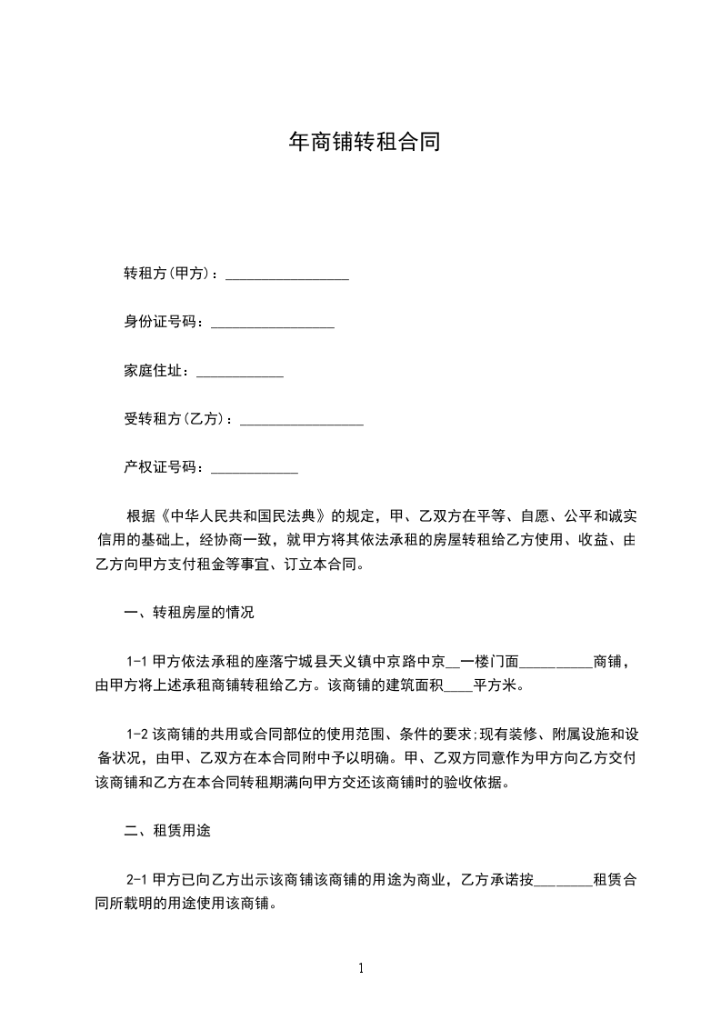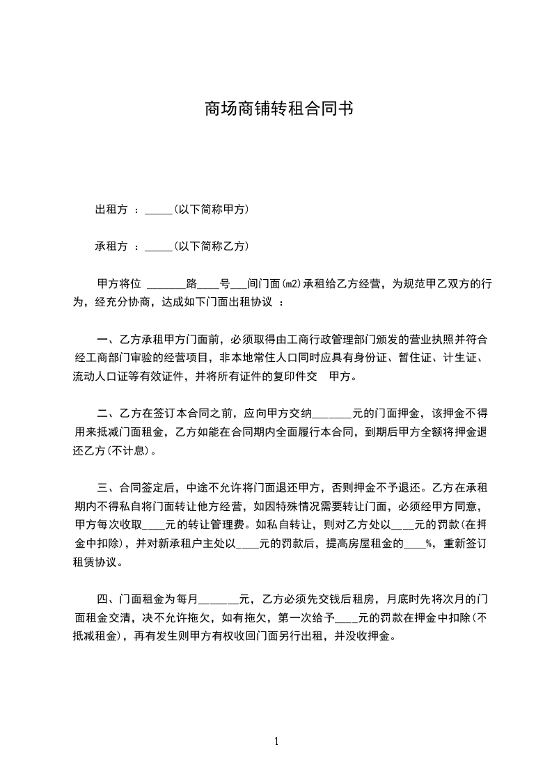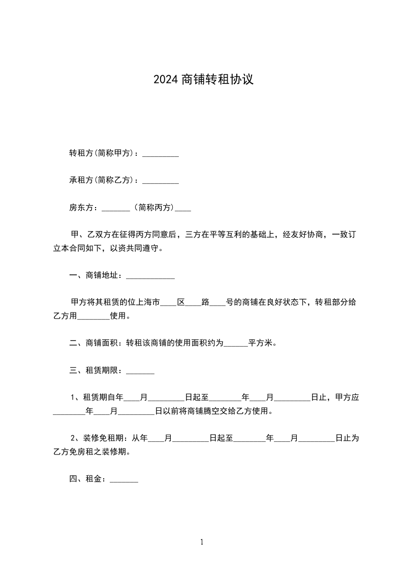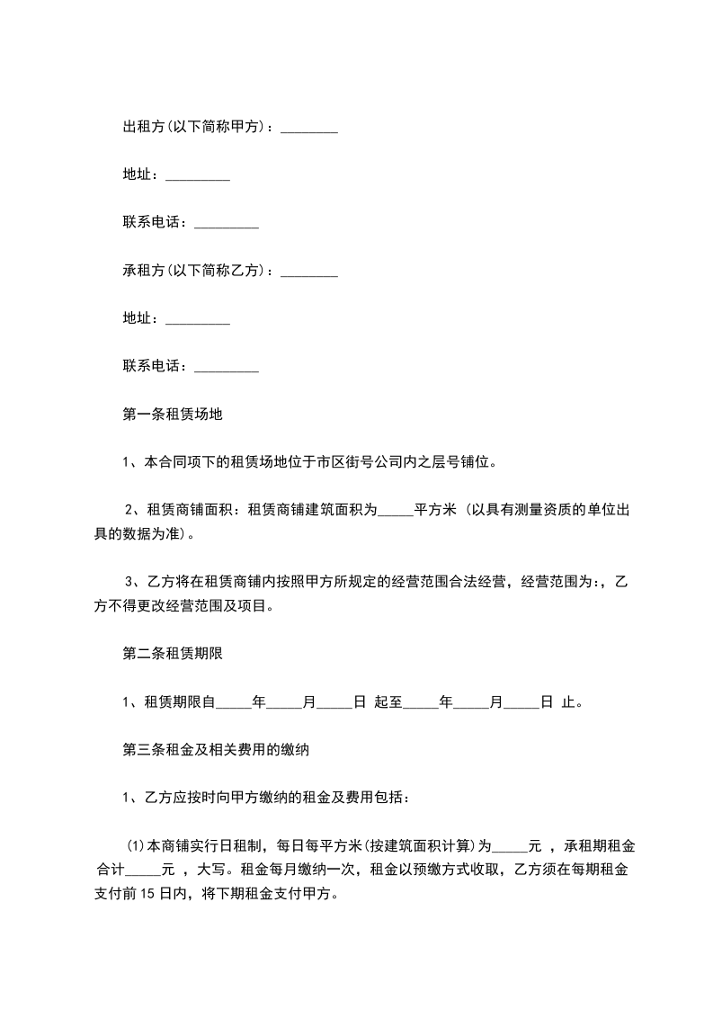 1、租赁期自年____月____日起至________年____月____日止,甲方应于________年____月____日以前将商铺腾空交给乙方使用。