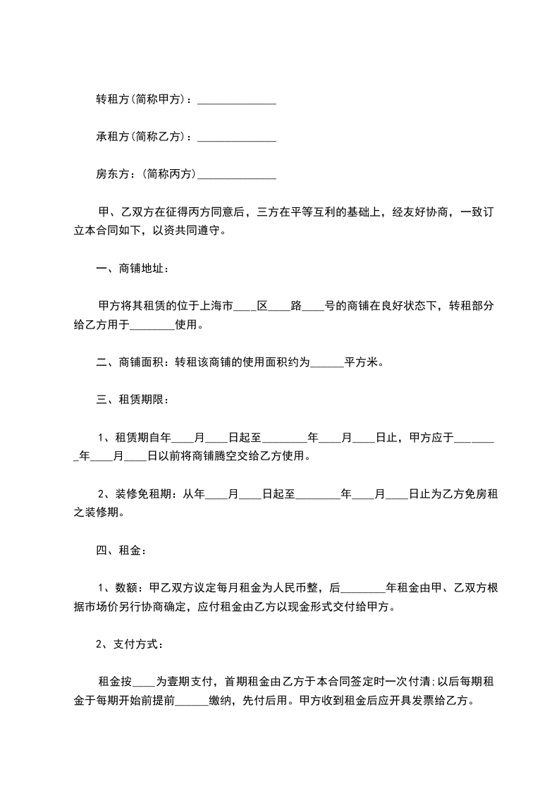 甲方将其租赁的位于上海市____区____路____号的商铺在良好状态下,转租部分给乙方用于________使用。