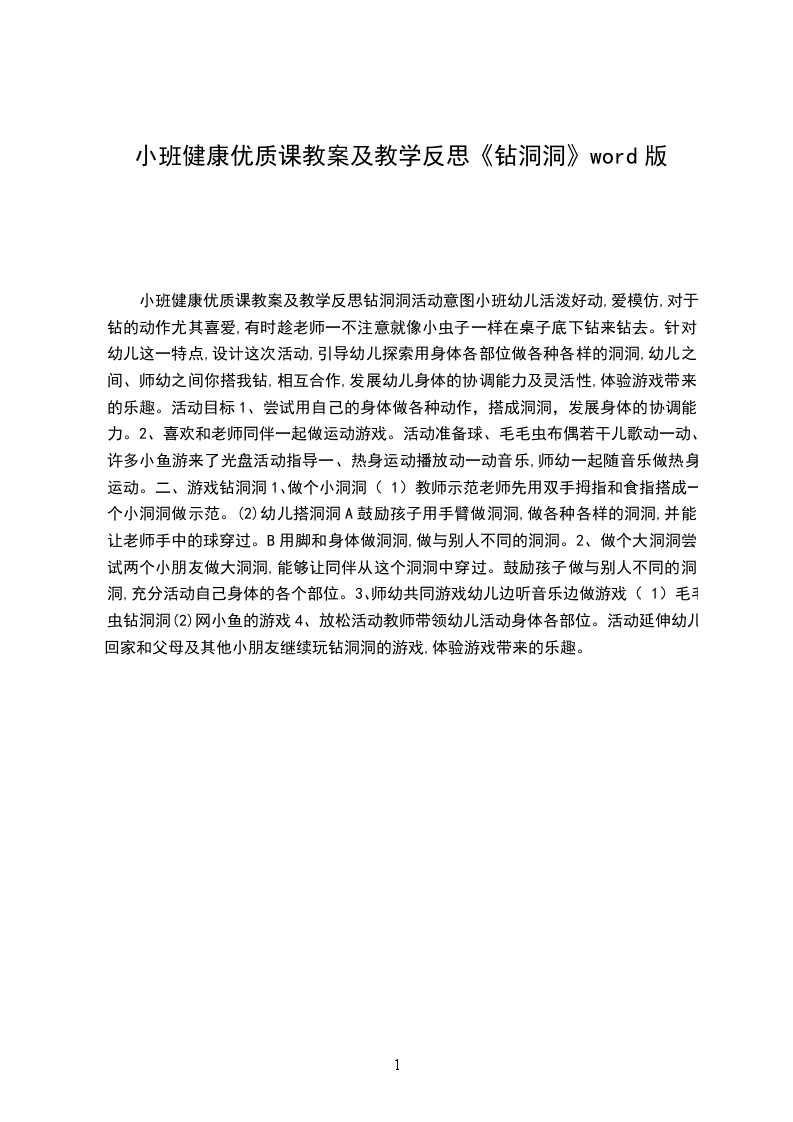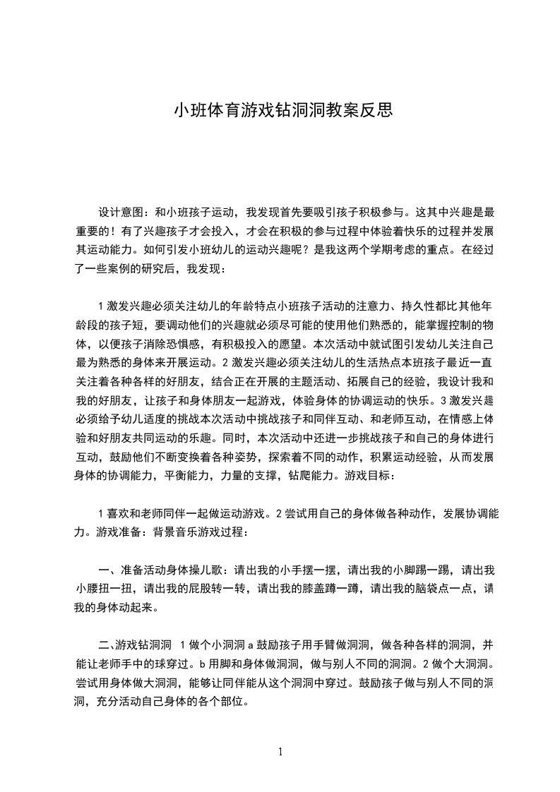 幼儿园小班体育教案 详案钻洞洞含反思设计意图:小班幼儿好动,爱模仿,尤其是对“钻”这个动作特别感兴趣。趁老师不留意时,在桌子下面钻来钻去,用小椅子搭个小山洞,钻一钻,喜爱查找一个不被人留意的小角落,象小虫子一样爬一爬,钻一钻。依据小班幼儿身心发育规律,结合幼儿园教育指导纲要精神:利用幼儿感兴趣的活动发展他们身体的协调性和敏捷性,给幼儿供应适当的材料,启发幼儿探索的欲望,设计本次活动,借用“小虫子”,让幼儿探索出身体部位各种各样的洞洞,同伴之间你搭我钻,师幼之间你搭我钻,幼儿之间相互合作,体验游玩中的开心心情,发展幼儿的探索精神和身体的协调性、敏捷性。活动目标: