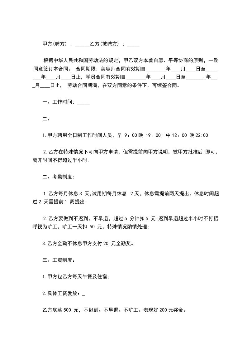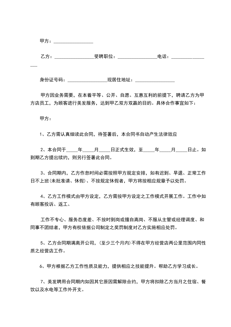 7、美发聘用合同期内如因其它原因需解除合约,甲方将扣除乙方当月之住宿、餐饮以及水电等工作外开支。
