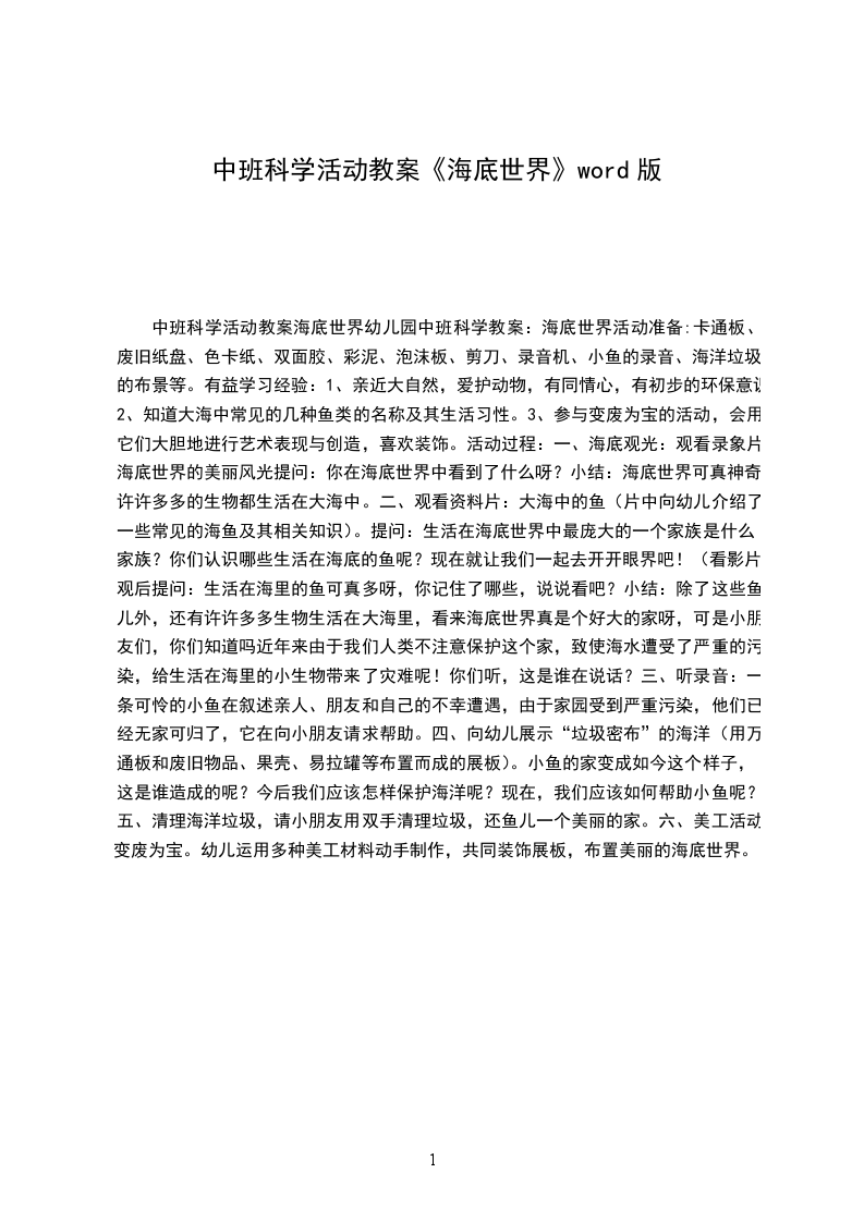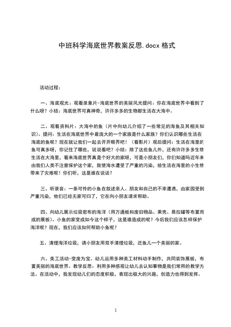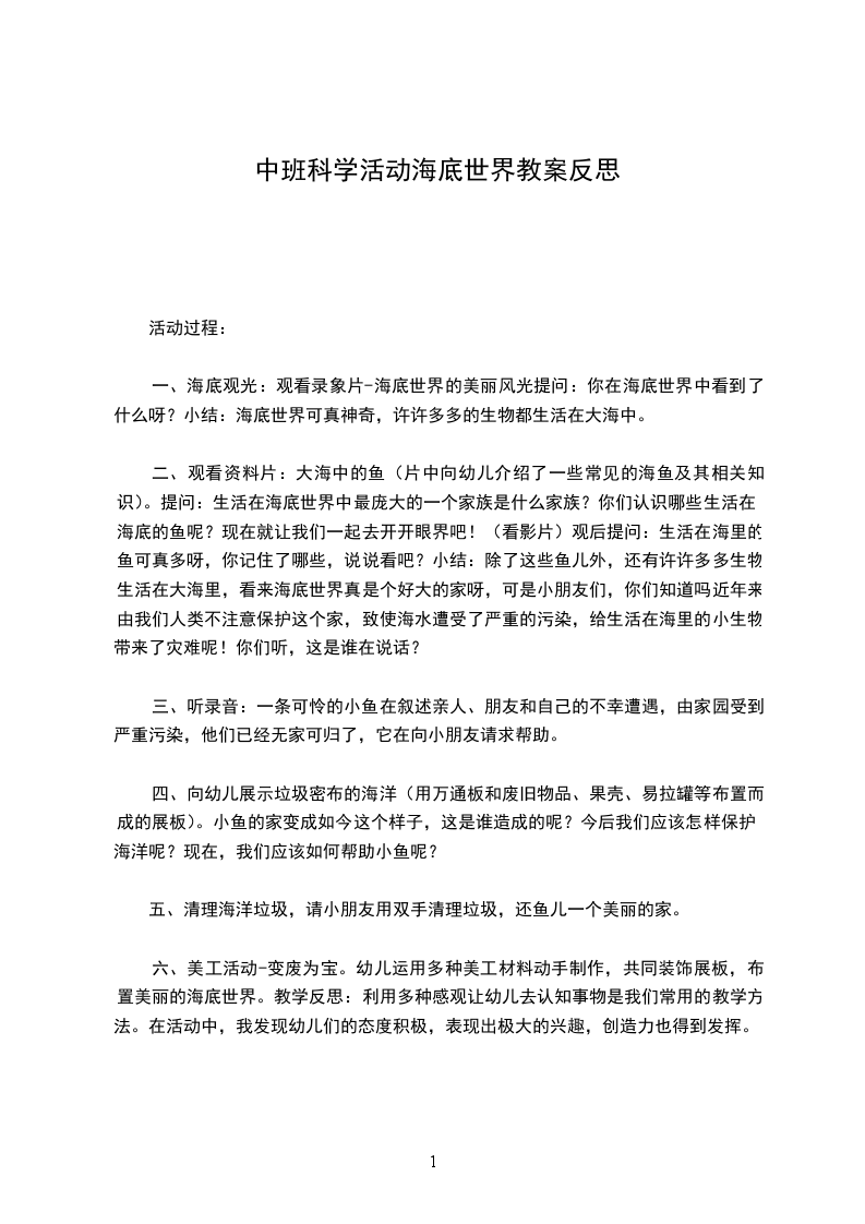 一、海底观光:观看录象片-海底世界的美丽风光提问:你在海底世界中看到了什么呀?小结:海底世界可真神奇,许许多多的生物都生活在大海中。