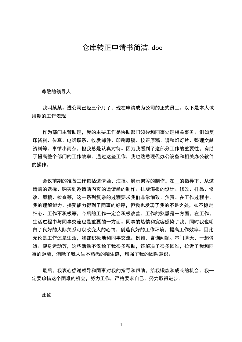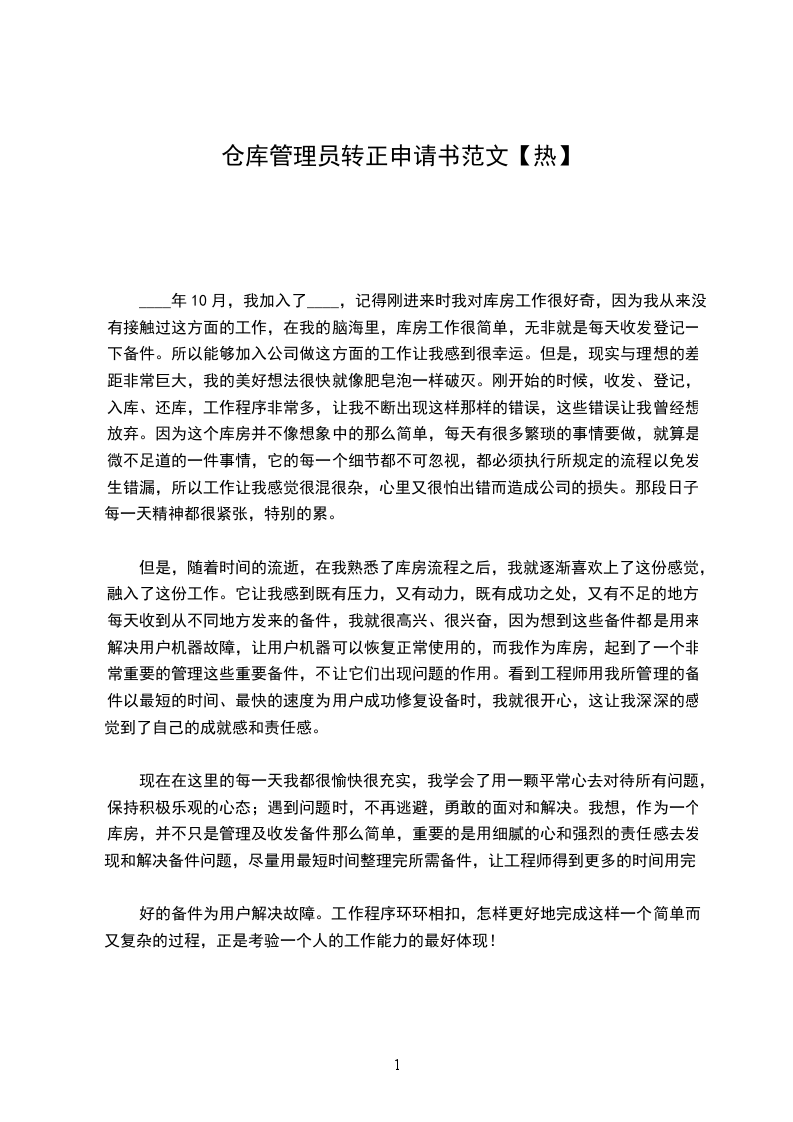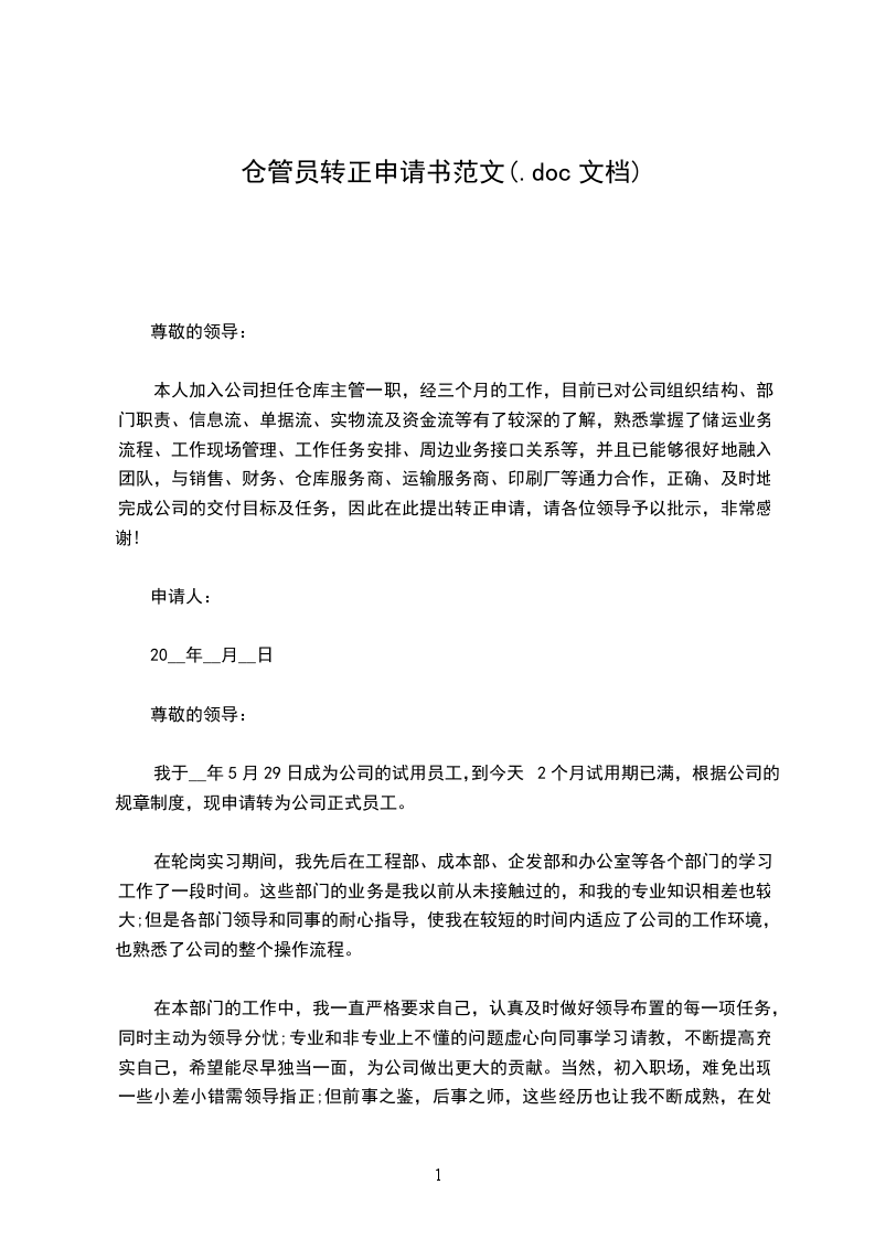 本人加入公司担任仓库主管一职,经三个月的工作,目前已对公司组织结构、部门职责、信息流、单据流、实物流及资金流等有了较深的了解,熟悉掌握了储运业务流程、工作现场管理、工作任务安排、周边业务接口关系等,并且已能够很好地融入团队,与销售、财务、仓库服务商、运输服务商、印刷厂等通力合作,正确、及时地完成公司的交付目标及任务,因此在此提出转正申请,请各位领导予以批示,非常感谢!