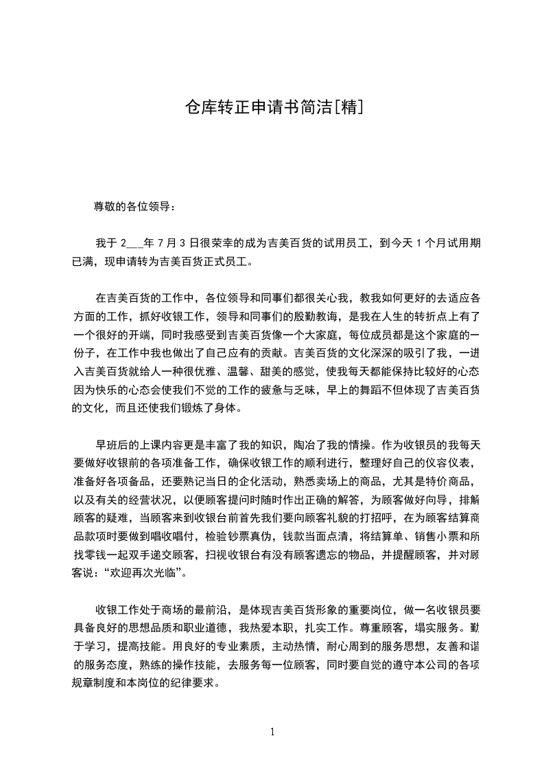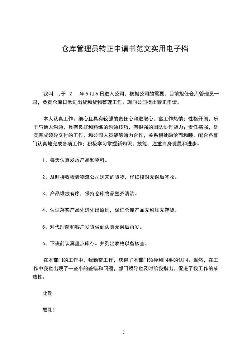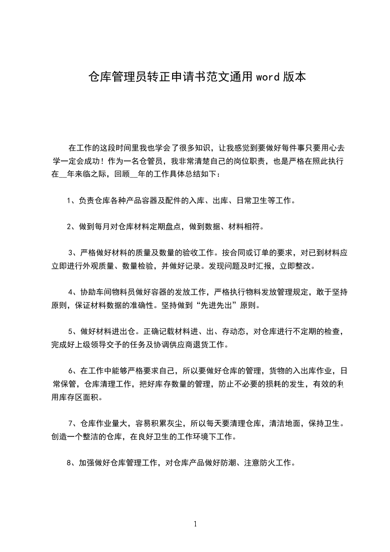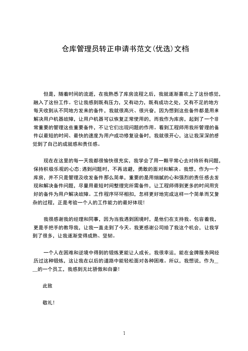 本人加入公司担任仓库主管一职,经三个月的工作,目前已对公司组织结构、部门职责、信息流、单据流、实物流及资金流等有了较深的了解,熟悉掌握了储运业务流程、工作现场管理、工作任务安排、周边业务接口关系等,并且已能够很好地融入团队,与销售、财务、仓库服务商、运输服务商、印刷厂等通力合作,正确、及时地完成公司的交付目标及任务,因此在此提出转正申请,请各位领导予以批示,非常感谢!