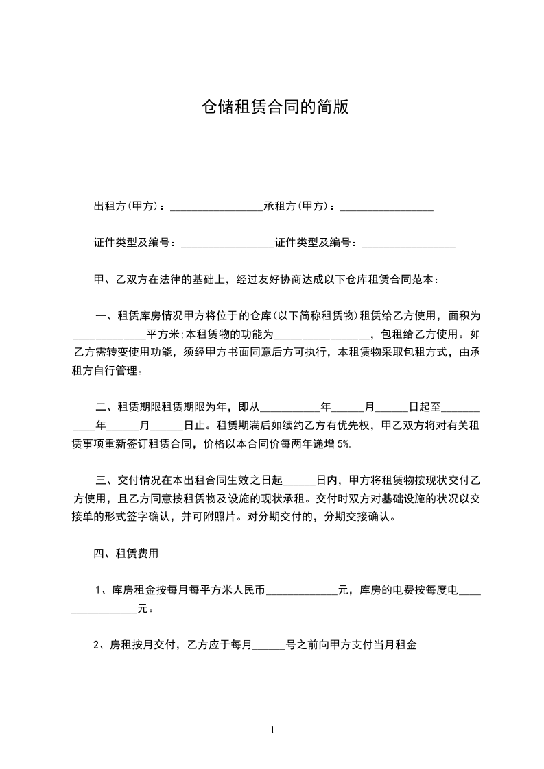 一、租赁库房情况甲方将位于的仓库(以下简称租赁物)租赁给乙方使用,面积为_____________平方米;本租赁物的功能为_________________,包租给乙方使用。如乙方需转变使用功能,须经甲方书面同意后方可执行,本租赁物采取包租方式,由承租方自行管理。