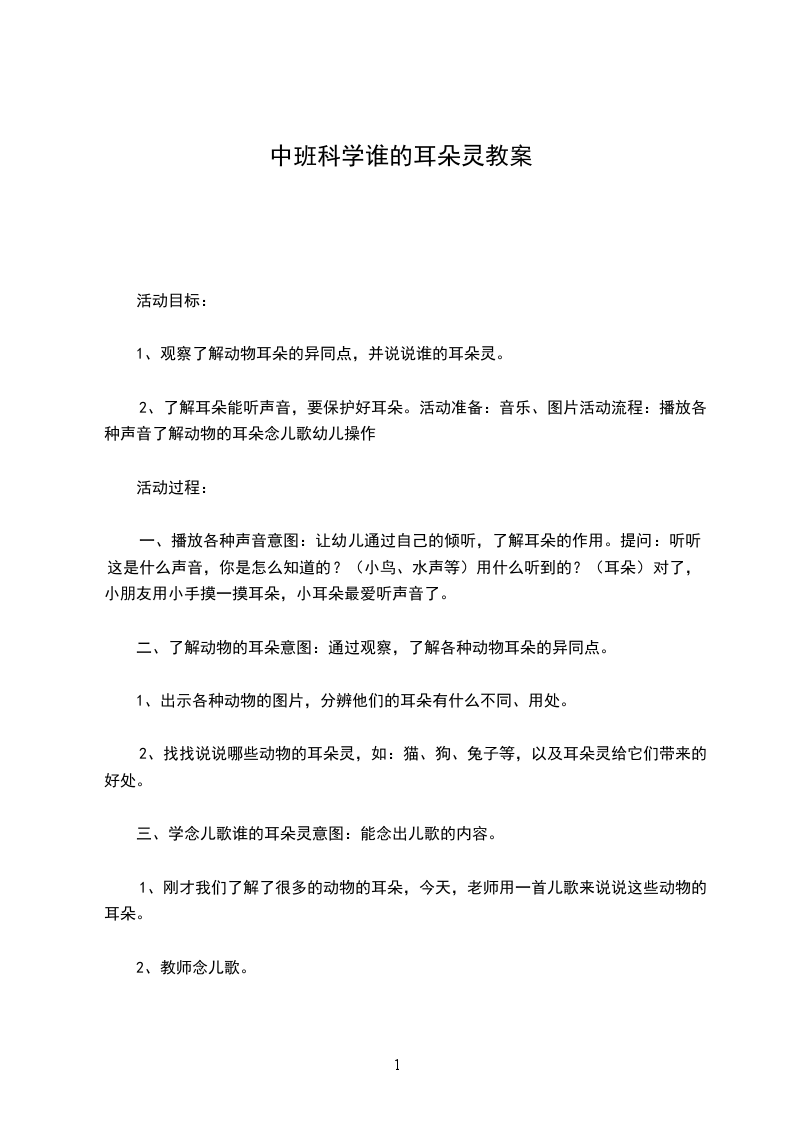 2、了解耳朵能听声音,要保护好耳朵。活动准备:音乐、图片活动流程:播放各种声音了解动物的耳朵念儿歌幼儿操作