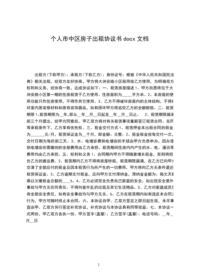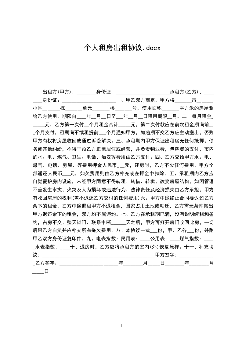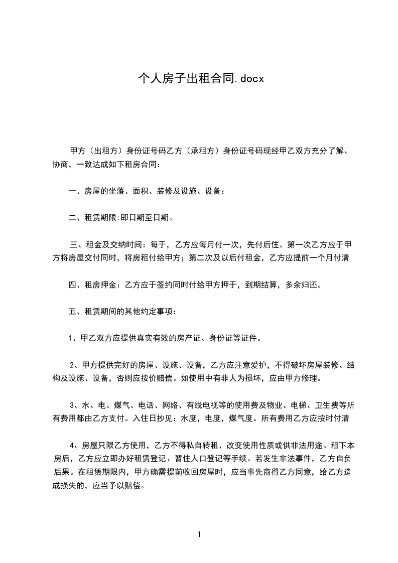 甲方(出租方)身份证号码乙方(承租方)身份证号码现经甲乙双方充分了解、协商,一致达成如下租房合同: