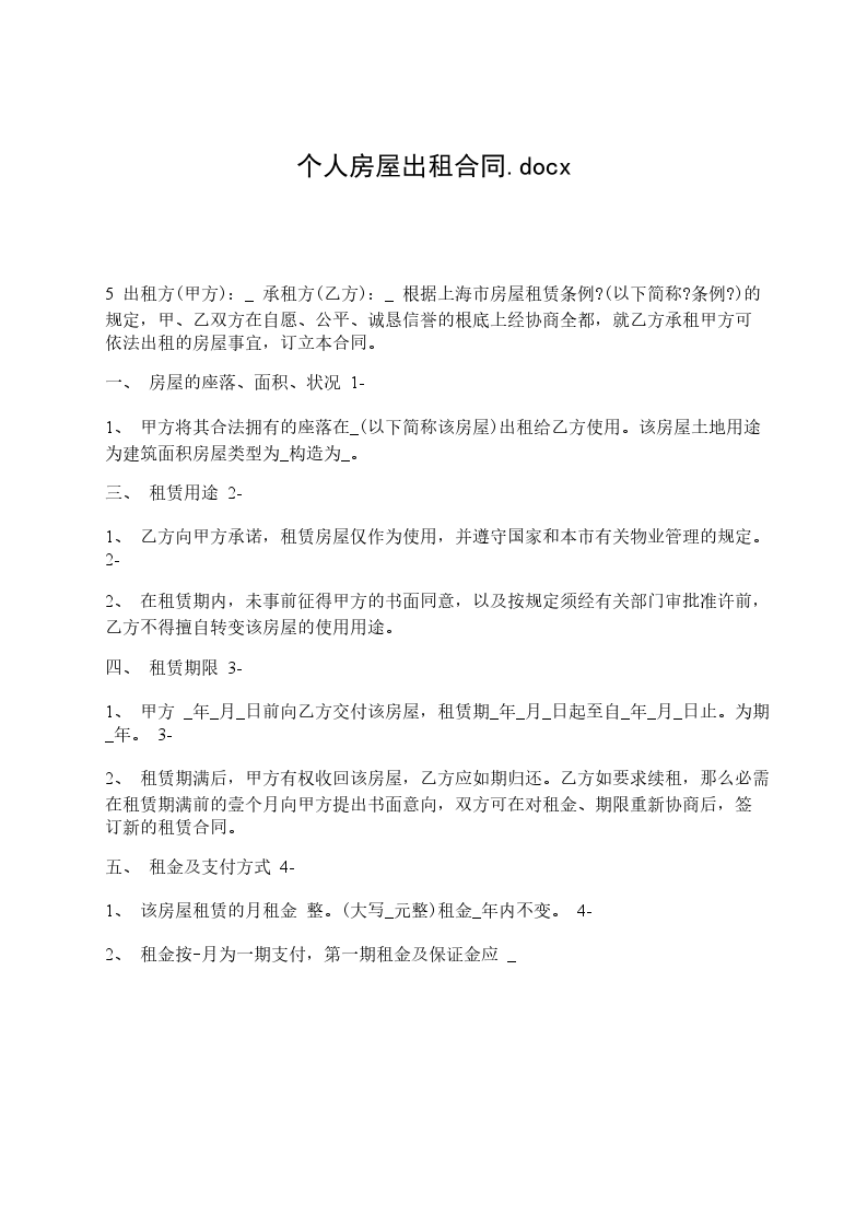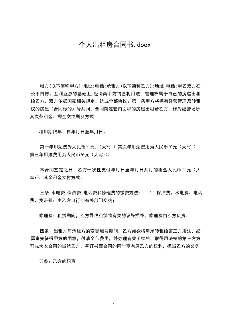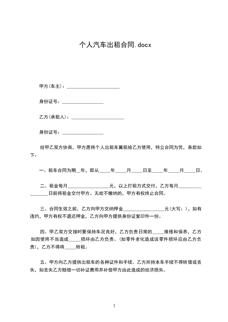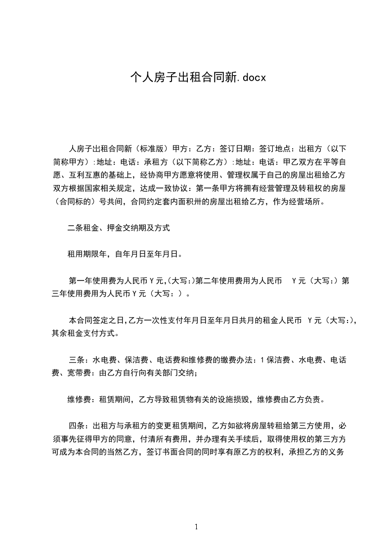 甲方(出租方)身份证号码乙方(承租方)身份证号码现经甲乙双方充分了解、协商,一致达成如下租房合同: