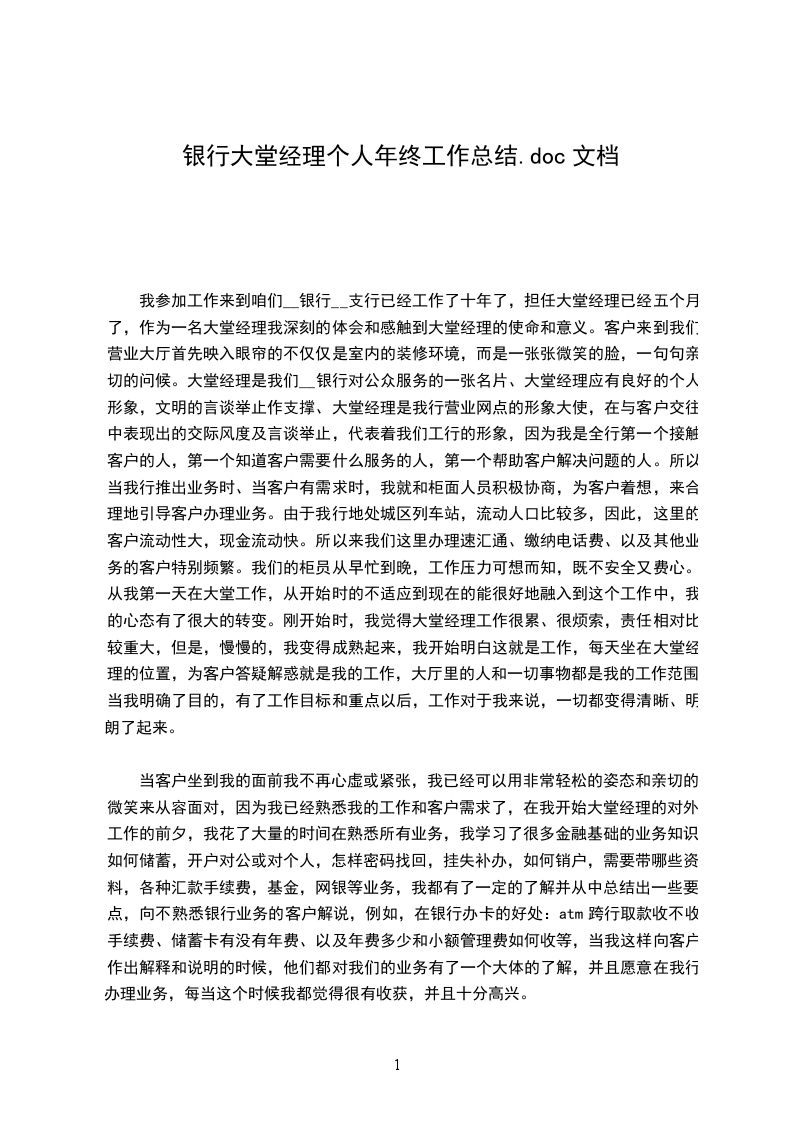 在20__年度,我不仅仅坚定履行的大堂经理的各项工作职责,还做好了自身所分管网点的安保以及文明单位的创建等工作内容。坚定维护保持营业厅内良好的工作秩序,成功地寻找到目标客户,进一步营销理财产品,实现服务与营销一体化。此外,为做好我网点的文明建设,我严格要求我行人员做好服务工作,做到用热情、大方,主动、规范的服务礼仪去接待客户,并在建设我行良好环境的基础上,强化员工行为规范,要求员工树立主动意识,负责态度,和良好的工作心态。为了做好服务工作,起好带头作用,更高的提升自身的服务水平,和业务能力,我积极参加银行所组织的各类培训活动,并自觉利用业余时间进行相关专业学习,强化自身理论水平与专业技能,加强自身的综合素质能力。