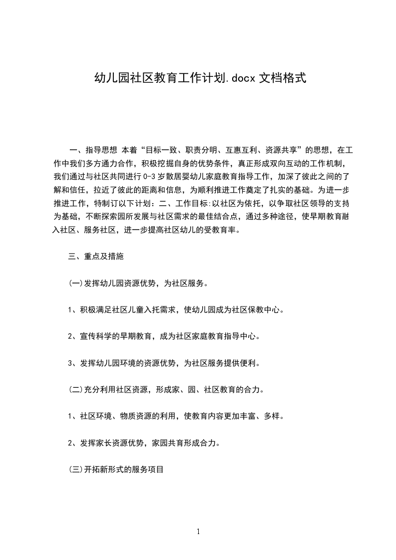 一、指导思想 本着“目标一致、职责分明、互惠互利、资源共享”的思想,在工作中我们多方通力合作,积极挖掘自身的优势条件,真正形成双向互动的工作机制,我们通过与社区共同进行0-3岁散居婴幼儿家庭教育指导工作,加深了彼此之间的了解和信任,拉近了彼此的距离和信息,为顺利推进工作奠定了扎实的基础。为进一步推进工作,特制订以下计划:二、工作目标:以社区为依托,以争取社区领导的支持为基础,不断探索园所发展与社区需求的最佳结合点,通过多种途径,使早期教育融入社区、服务社区,进一步提高社区幼儿的受教育率。