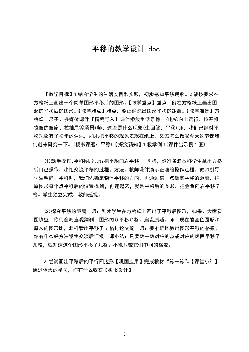 【教学目标】1结合学生的生活实例和实践,初步感知平移现象。2能按要求在方格纸上画出一个简单图形平移后的图形。【教学重点】重点:能在方格纸上画出图形的平移后的图形。【教学难点】难点:能正确说出图形平移的距离。【教学准备】方格纸、尺子、多媒体课件【情境导入】课件播放生活录像。(电梯向上运行、拉开推拉窗的窗扇、拉抽屉等场景)师:这些是什么现象(生回答:平移)师:我们已经对平移现象有了初步的认识,如果把平移的现象表现在纸上,又该怎么做呢今天这节课我们就来研究一下。(板书课题:平移)【探究新知】1教学例1(课件出示例1图)