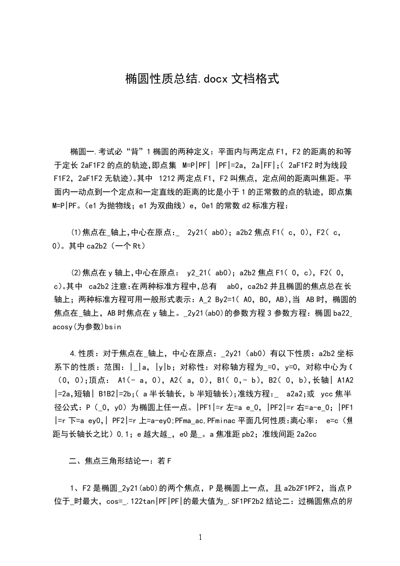 4.性质:对于焦点在_轴上,中心在原点:_2y21(ab0)有以下性质:a2b2坐标系下的性质:范围:|_|a,|y|b;对称性:对称轴方程为_=0,y=0,对称中心为O(0,0);顶点:A1(-a,0),A2(a,0),B1(0,-b),B2(0,b),长轴|A1A2|=2a,短轴|B1B2|=2b;(a半长轴长,b半短轴长);准线方程:_a2a2;或ycc焦半径公式:P(_0,y0)为椭圆上任一点。|PF1|=r左=a e_0,|PF2|=r右=a-e_0;|PF1|=r下=a ey0,|PF2|=r上=a-ey0;PFma_ac,PFminac平面几何性质:离心率:e=c(焦距与长轴长之比)0,1;e越大越_,e0是_。a焦准距pb2;准线间距2a2cc