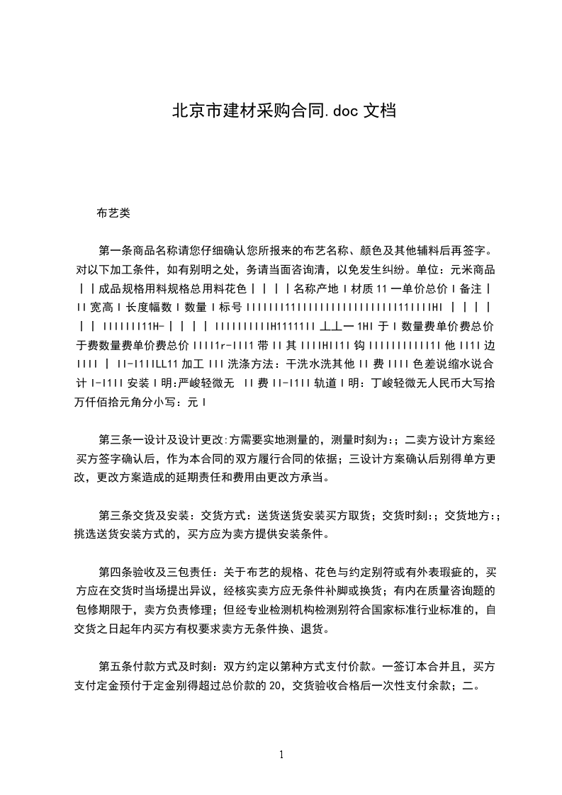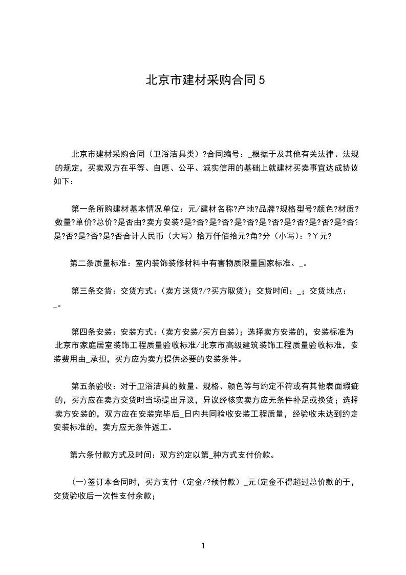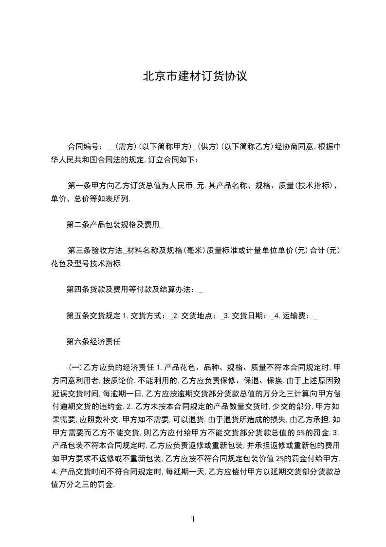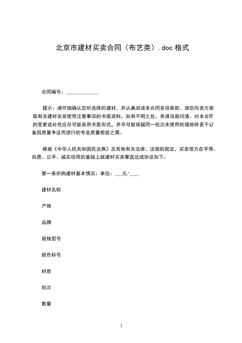 北京市建材买卖合同橱柜定购类(BF0110)通用版买方:_卖方:_依据中华人民共和国民法典及其他有关法律、法规的规定,买卖双方在平等、自愿、公平、诚实信用的基础上就建材买卖事宜达成协议如下:第一条所购建材基本状况:品名:_产地:_材质:_颜色:_规格:_数量:_单价:_总价:_地柜:_吊柜:_台面:_燃气灶:_抽烟机:_水槽:_龙头:_配件:_其他:_备注:_合计人民币(大写)_(小写):_元