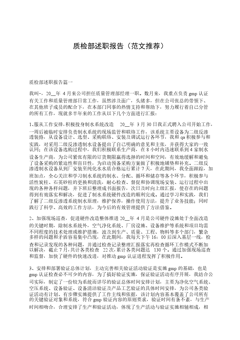 作为一名新员工,工作总结还过于遥远,因为我对工作上的许多问题还是知之甚少。但经_的指点,结合初加工的生产流程,还是对不同的产品工艺有了实践上的认识。特别是_,因为车间内长时间的加工,也大体上了解生产线上易出现的问题。但对于产品有质量上影响的外来因素还是很不清楚。学习工作的这段时间,我了解到对于初加工主要针对的是控制杂质和掌握半成品的规格,后者工艺上有明确的规定。除了发酵室内的温、湿度与时间可因实际情况而有所改变外,其它基本上是要一步步按照工艺完成。特别是对重量与大小的要求,但针对前者,加工过程所需的器具与设备中有杂质能混入产品;因清理不当而混入的也不无所在;甚至于员工身上的穿戴上也会有混入的可能,等等。感觉上种类甚多,但实际上要寻找观察时却是找不到一点儿头绪,只有对毛发的控制,那是显而易见的,除此之外,我也仅仅了解落地产品的处理了。对于整个工序还有部分问题,我了解它的存在,但却不理解。如:车间对于各种产品在包制过程中必须分清批次,而这项工作的意义是什么?发现异常问题后,要将有可能受到质量影响的产品单独存放,但怎样的算是有可能接触?如何单独存放?存放到什么地方?工序出现怎样的问题应该停止生产,改变到什么程度可以继续?在停产过程中,之前加工的产品怎么处理?等等。还有很多更细小的,不知道该怎样实施。还有一部分是我感觉存在,需要我去学习,但我并不明确它指的是什么?只是在开会时,会听到一些前所未闻的工作用语。由于工作时间较短,对于各方面的了解都过于肤浅,过多的疑惑让我感觉在工作上有头无尾,有尾无身,渴望能在年前学出点门路,我会抓紧时间,加倍努力,以最快的速度消化吸收。作为一名年纪偏小的新员工,我会虚心向大家学习,在20__年结束之前,有个阶段性的提高,在20__年里,我会认真属于质检员岗位职责进行工作,尽快争取与大家同步,做一名合格的品质管理人员。质检员个人年终总结三:我于__年参加了三个项目,在__项目担任黑色站核算员,在__项目担任质检员,在__项目担任测量员。在江秀担任黑色站核算员期间,我每天都把当天的人工、材料、机械等方面涉及到的数据统计清楚,统计好当天的材料消耗、进场情况,以便发现问题及时改正,作为成本核算的依据。管好自己手中的钱,记下每笔费用的收入、支出、结余情况,做好材料、行政办公用品的台帐,做到各种用品出库、入库都有据可依。__.8.19号我被分配到__项目质检科担任质检员。由于项目前期内业没跟上,我与赵建龙同志一起整理内业。在这期间,我向赵建龙同志学习到很多写内业的规则,对内业的整理工作有了一定的了解,但对于桥梁的内业还很陌生,以后有机会,我一定会加强这方面的学习。由于__项目工期紧,任务急,人员也十分有限,我在