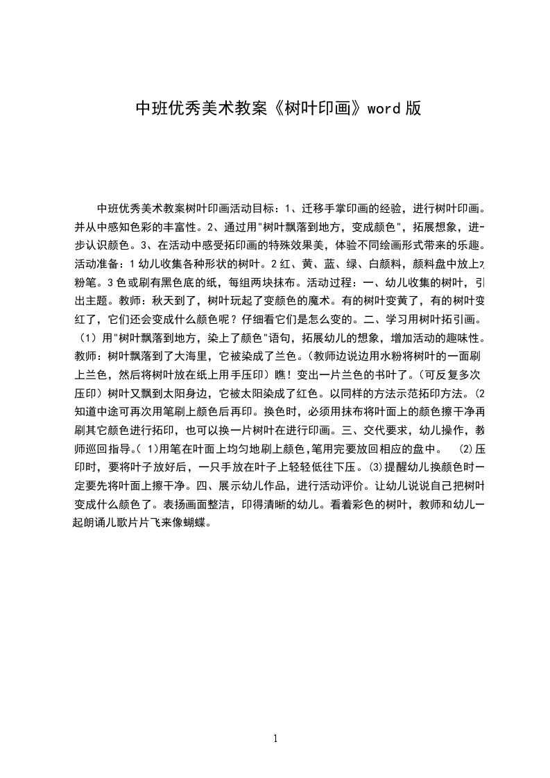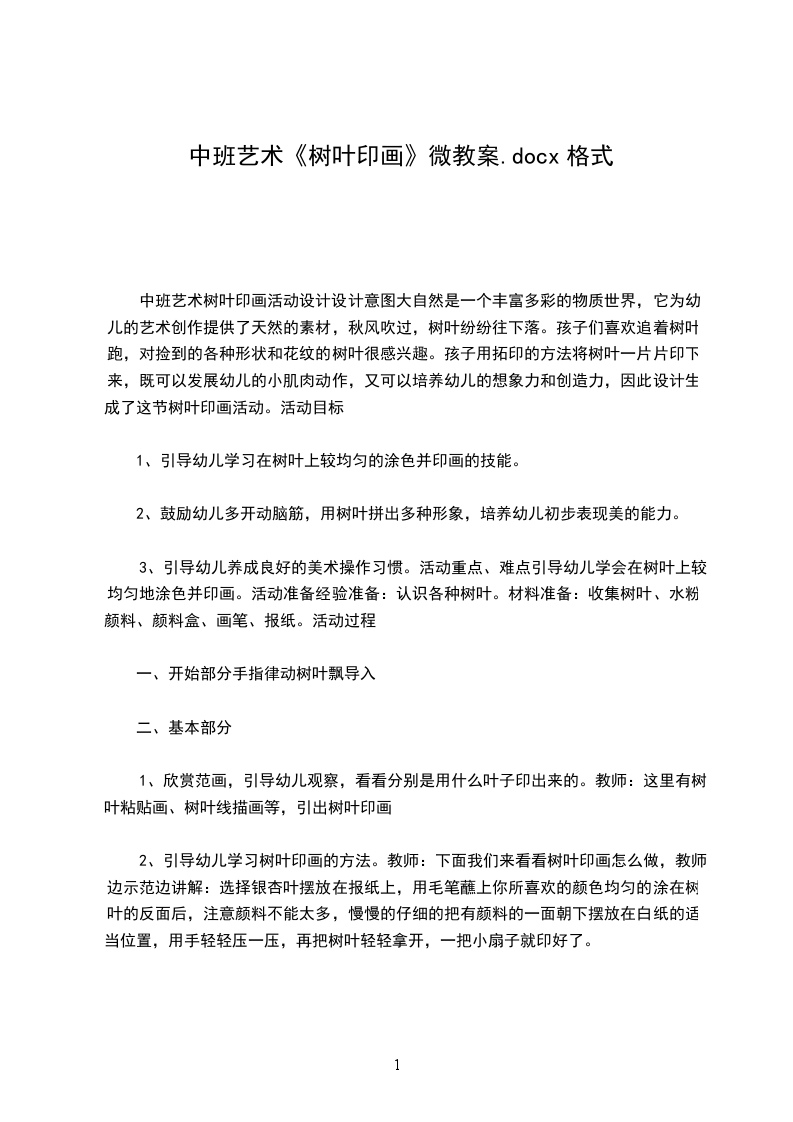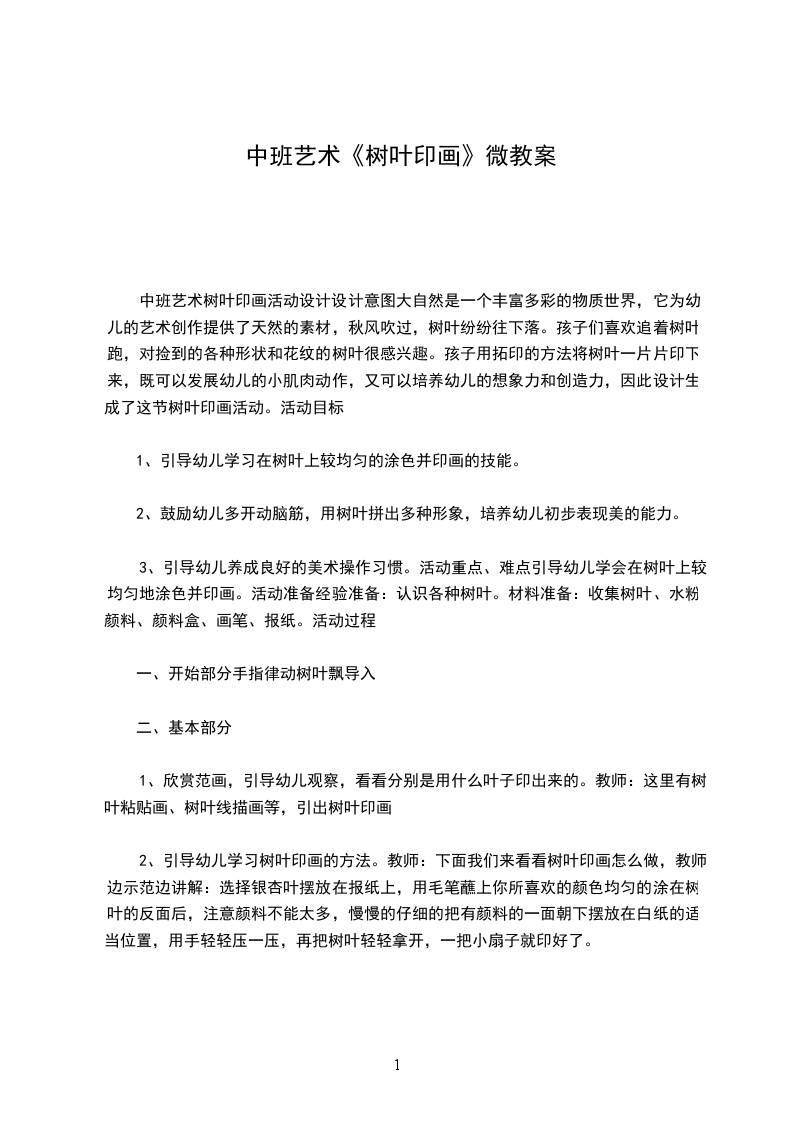 中班艺术树叶印画活动设计设计意图大自然是一个丰富多彩的物质世界,它为幼儿的艺术创作提供了天然的素材,秋风吹过,树叶纷纷往下落。孩子们喜欢追着树叶跑,对捡到的各种形状和花纹的树叶很感兴趣。孩子用拓印的方法将树叶一片片印下来,既可以发展幼儿的小肌肉动作,又可以培养幼儿的想象力和创造力,因此设计生成了这节树叶印画活动。活动目标
