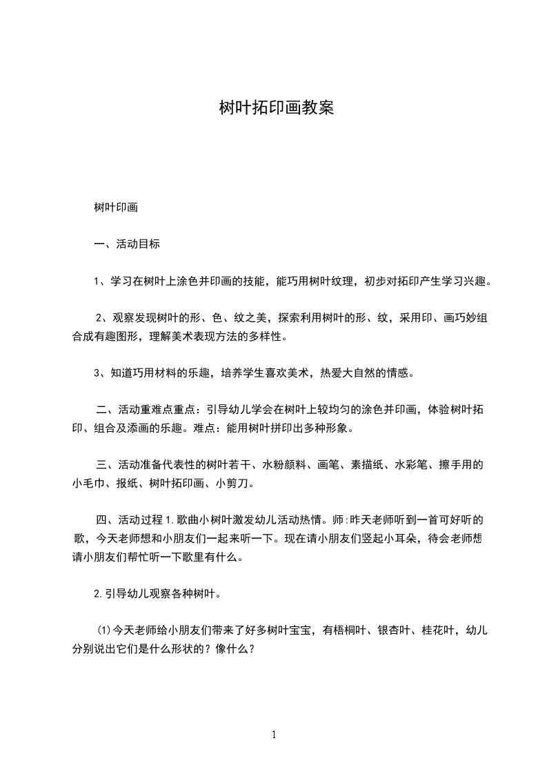 3、引导幼儿养成良好的美术操作习惯。活动重点、难点引导幼儿学会在树叶上较均匀地涂色并印画。活动准备经验准备:认识各种树叶。材料准备:收集树叶、水粉颜料、颜料盒、画笔、报纸。活动过程