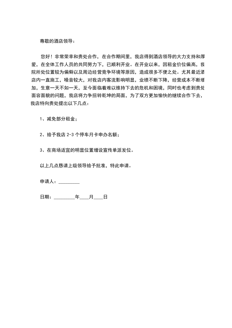 您好!非常荣幸和贵处合作,在合作期间里,我店得到酒店领导的大力支持和厚爱,在全体工作人员的共同努力下,已顺利开业。在开业以来,因租金价位偏高,我院所处位置较为偏僻以及周边经营竞争环境等原因,造成很多不便之处。尤其最近酒店内一直施工,噪音较大,对我店内客流影响明显,业绩不断下降,经营成本不断增加,生意一天不如一天,至今面临着难以维持下去的危机和困境,同时也考虑到贵处面容面貌的问题,我店将力争扭转乾坤的局面,为了双方更加愉快的继续合作下去,我店特向贵处提出以下几点: