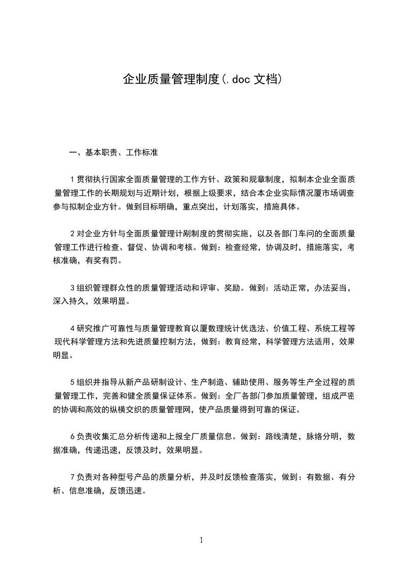 1贯彻执行国家全面质量管理的工作方针、政策和规章制度,拟制本企业全面质量管理工作的长期规划与近期计划,根据上级要求,结合本企业实际情况厦市场调查,参与拟制企业方针。做到目标明确,重点突出,计划落实,措施具体。