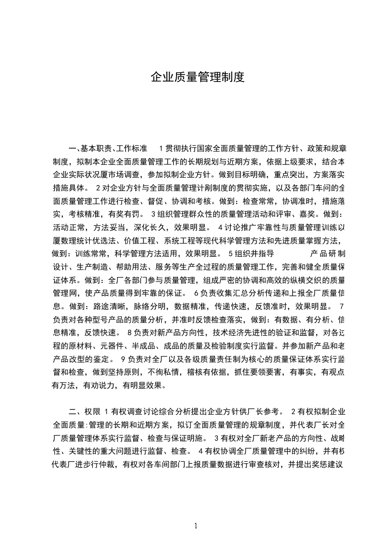 2有权拟制企业全面质量:管理的长期和近期计划,拟订全面质量管理的规章制度,并代表厂长对全厂质量管理体系实行监督、检查与保证实施。