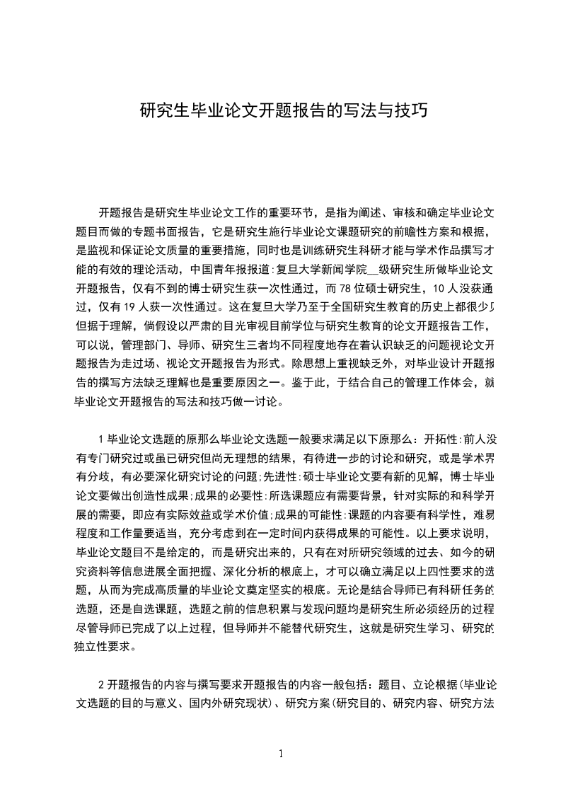 开题报告是研究生毕业论文工作的重要环节,是指为阐述、审核和确定毕业论文题目而做的专题书面报告,它是研究生施行毕业论文课题研究的前瞻性方案和根据,是监视和保证论文质量的重要措施,同时也是训练研究生科研才能与学术作品撰写才能的有效的理论活动,中国青年报报道:复旦大学新闻学院__级研究生所做毕业论文开题报告,仅有不到的博士研究生获一次性通过,而78位硕士研究生,10人没获通过,仅有19人获一次性通过。这在复旦大学乃至于全国研究生教育的历史上都很少见。但据于理解,倘假设以严肃的目光审视目前学位与研究生教育的论文开题报告工作,可以说,管理部门、导师、研究生三者均不同程度地存在着认识缺乏的问题视论文开题报告为走过场、视论文开题报告为形式。除思想上重视缺乏外,对毕业设计开题报告的撰写方法缺乏理解也是重要原因之一。鉴于此,于结合自己的管理工作体会,就毕业论文开题报告的写法和技巧做一讨论。