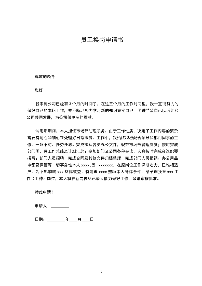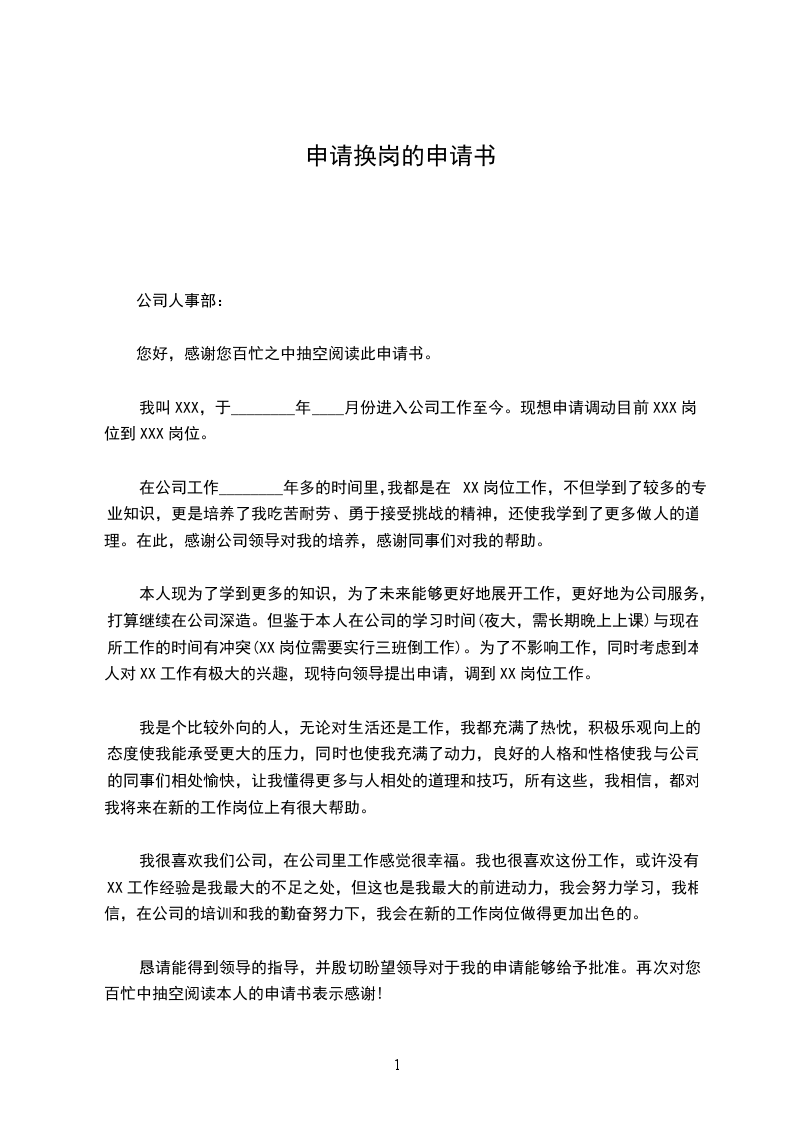 我叫XXX,于________年____月份进入公司工作至今。现想申请调动目前XXX岗位到XXX岗位。