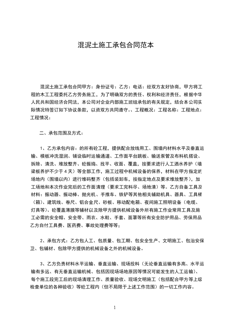 1乙方承包内容:的所有胫工程,提供配合放线用工、围墙内材料水平及垂直运输、模板冲洗湿润、铺设临时运输通道、工作面平台跳板、输送泵管及布料机搭设、拆除、清洗、堆放整齐、磴振捣、找平、收面、覆盖,按要求进行人工洒水养护(墙梁板养护不少于4天)等全部工作,施工过程中机械设备的保养,材料在甲方指定的场地内(围墙以内)进行堆码整齐(包括装卸车,按指定地点及要求堆放整齐),加工场地和本次作业完后的工作面清理(要求工完料尽、场地清)等。乙方自备工具及材料:振动器、振动棒、抛光机、手推车、铁铲等其他相关辅助机具、器具、工具桶(箱)、建筑线、卷尺、铝合金尺、砂板、移动配电箱、夜间施工照明设备(电缆、灯具等)、腔覆盖薄膜等辅材以及除甲方提供机械设备外所有施工作业常用工具及施工必需的安全帽、安全带、雨衣、水鞋、手套、面罩等所有安全防护用品、劳保用品;乙方自付工具费、医药费、事故处理费等等;