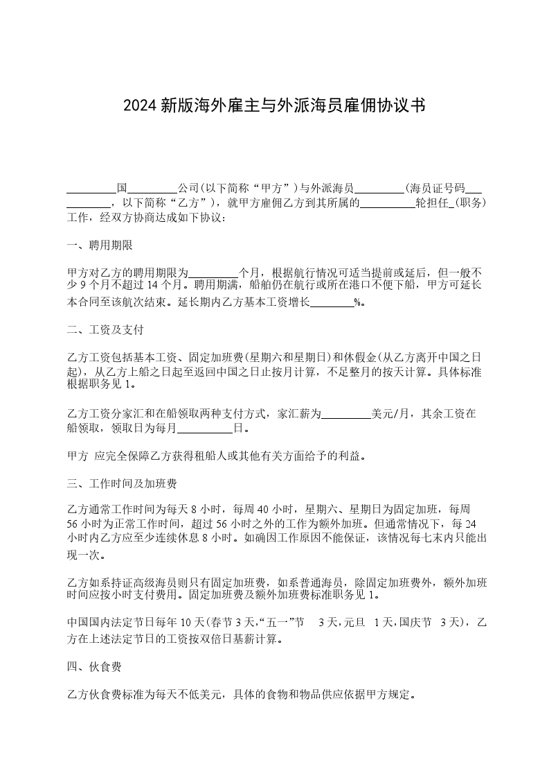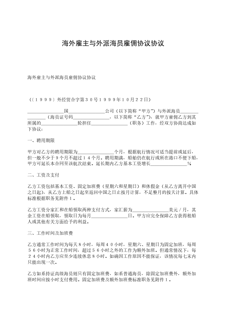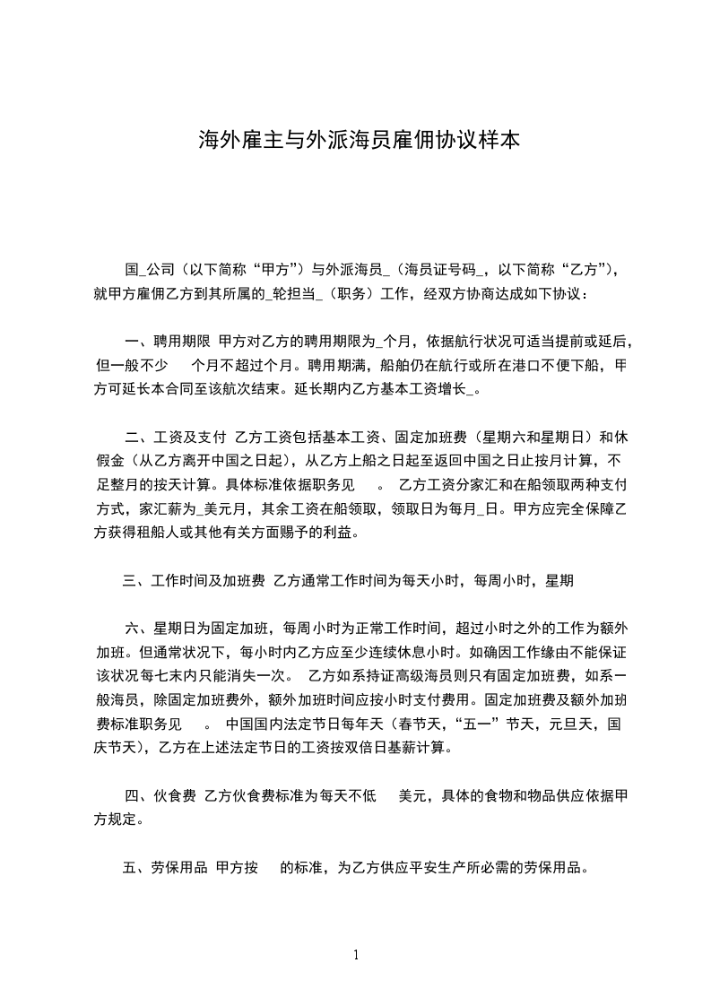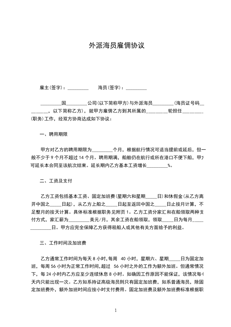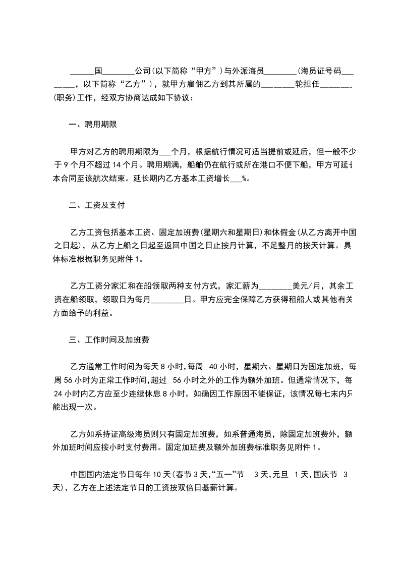 ________国________公司(以下简称“甲方”)与外派海员________(海员证号码________,以下简称“乙方”),就甲方雇佣乙方到其所属的________轮担任________(职务)工作,经双方协商达成如下协议: