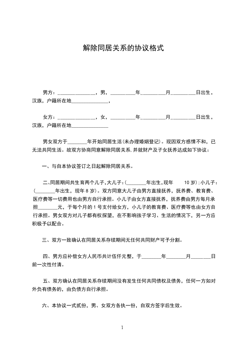 男女双方于________年开始同居生活(未办理婚姻登记)。现因双方感情不和,已无法共同生活。故双方协商同意解除同居关系,并就财产及子女抚养达成如下协议: