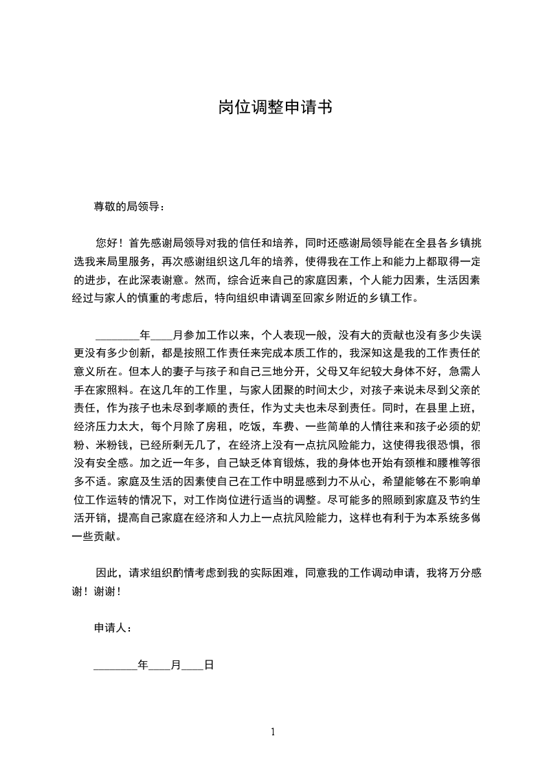 ________年____月参加工作以来,个人表现一般,没有大的贡献也没有多少失误更没有多少创新,都是按照工作责任来完成本质工作的,我深知这是我的工作责任的意义所在。但本人的妻子与孩子和自己三地分开,父母又年纪较大身体不好,急需人手在家照料。在这几年的工作里,与家人团聚的时间太少,对孩子来说未尽到父亲的责任,作为孩子也未尽到孝顺的责任,作为丈夫也未尽到责任。同时,在县里上班,经济压力太大,每个月除了房租,吃饭,车费、一些简单的人情往来和孩子必须的奶粉、米粉钱,已经所剩无几了,在经济上没有一点抗风险能力,这使得我很恐惧,很没有安全感。加之近一年多,自己缺乏体育锻炼,我的身体也开始有颈椎和腰椎等很多不适。家庭及生活的因素使自己在工作中明显感到力不从心,希望能够在不影响单位工作运转的情况下,对工作岗位进行适当的调整。尽可能多的照顾到家庭及节约生活开销,提高自己家庭在经济和人力上一点抗风险能力,这样也有利于为本系统多做一些贡献。