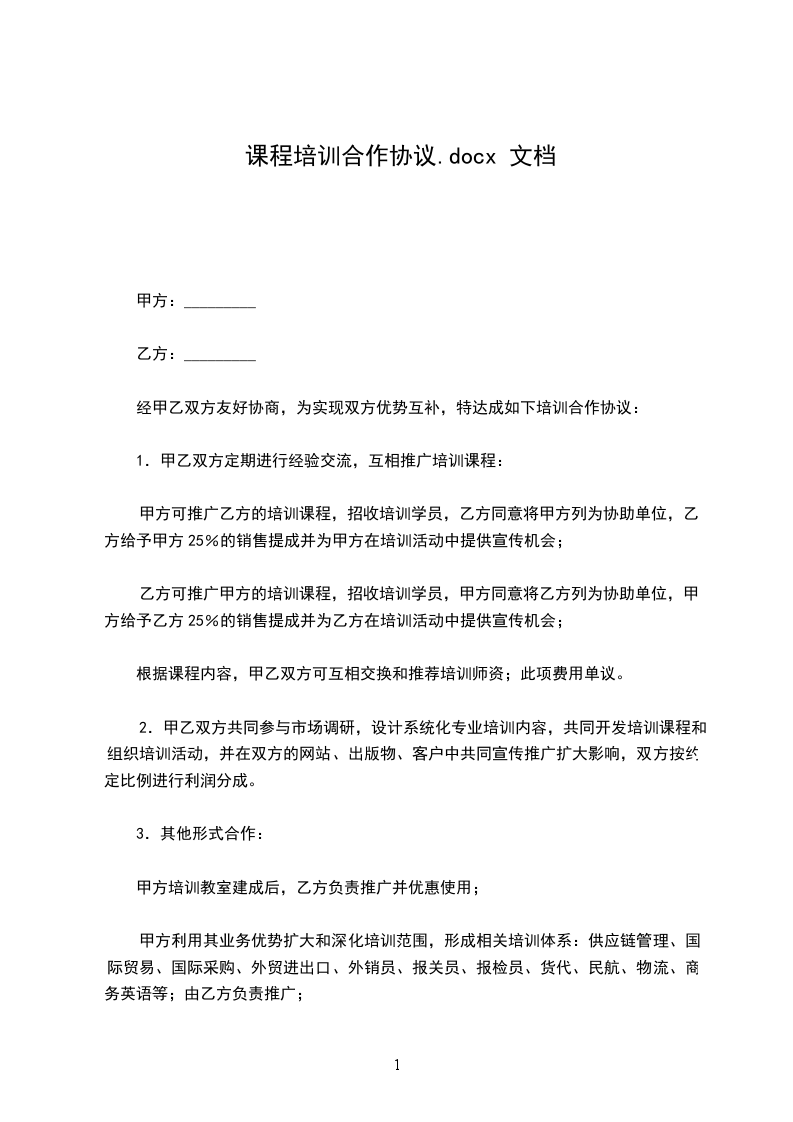 甲方可推广乙方的培训课程,招收培训学员,乙方同意将甲方列为协助单位,乙方给予甲方25%的销售提成并为甲方在培训活动中提供宣传机会;