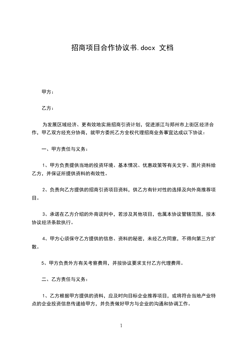 为发展区域经济、更有效地实施招商引资计划,促进浙江与郑州市上街区经济合作,甲乙双方经充分协商,就甲方委托乙方全权代理招商业务事宜达成以下协议: