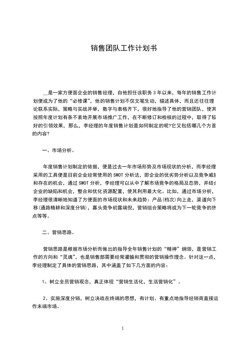 __是一家方便面企业的销售经理,自他担任该职务3年以来,每年的销售工作计划便成为了他的“必修课”,他的销售计划不仅文笔生动,描述具体,而且还往往理论联系实际,策略与实战并举,数字与表格齐下,很好地指导了他的营销团队,使其按照年度计划有条不紊地开展市场推广工作,在不断修订和检核的过程中,取得了较好的引领效果,那么,李经理的年度销售计划是如何制定的呢?它又包括哪几个方面的内容?