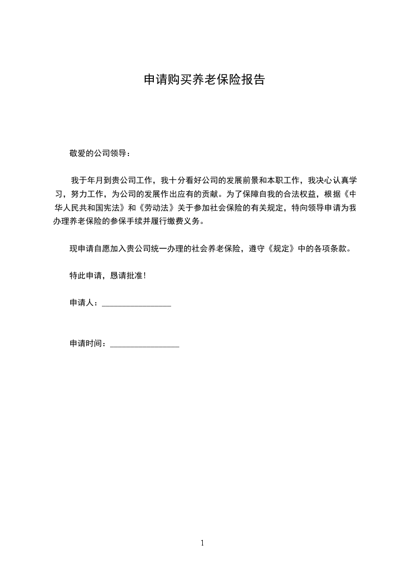 我于年月到贵公司工作,我非常看好公司的发展前景和本职工作,我决心认真学习,努力工作,为公司的发展作出应有的贡献。为了保障自己的合法权益,根据《中华人民共和国宪法》和《劳动法》关于参加社会保险的有关规定,特向领导申请为我办理养老保险的参保手续并履行缴费义务。