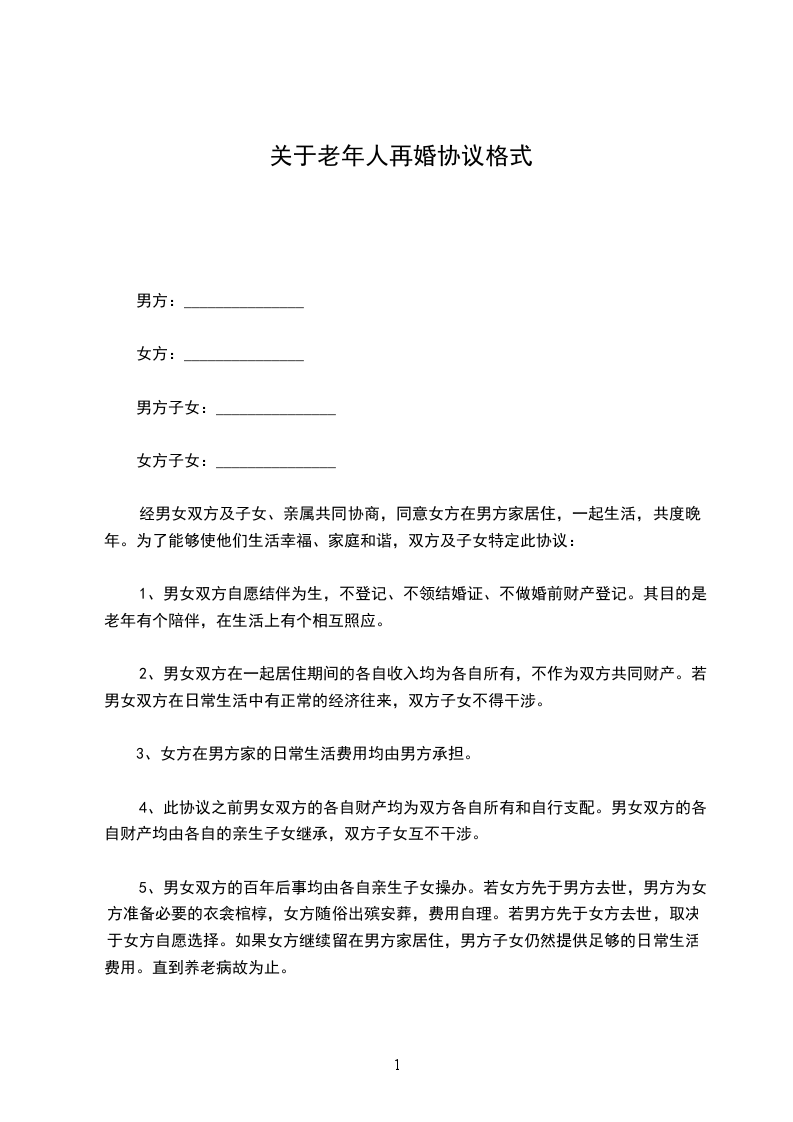 经男女双方及子女、亲属共同协商,同意女方在男方家居住,一起生活,共度晚年。为了能够使他们生活幸福、家庭和谐,双方及子女特定此协议: