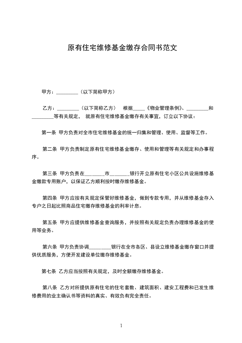 乙方:_________(以下简称乙方) 根据_____《物业管理条例》、_________和_________等有关规定, 就原有住宅维修基金缴存有关事宜,订立以下协议: