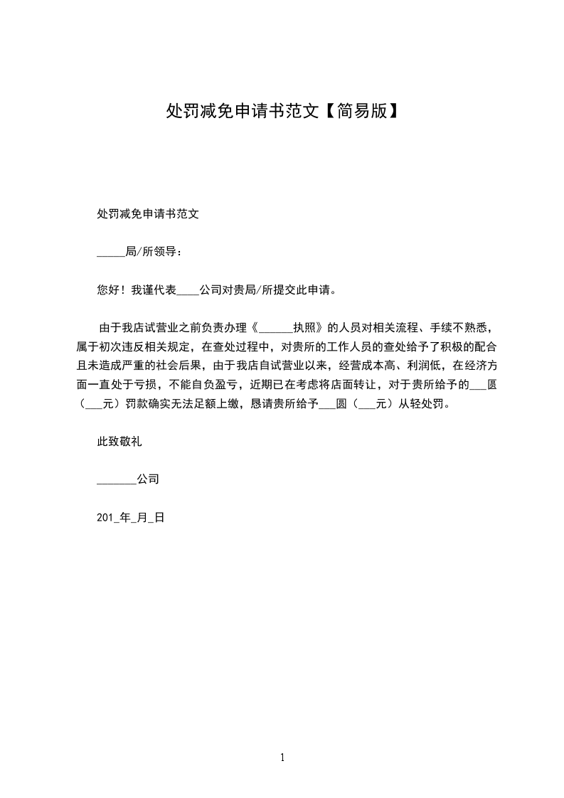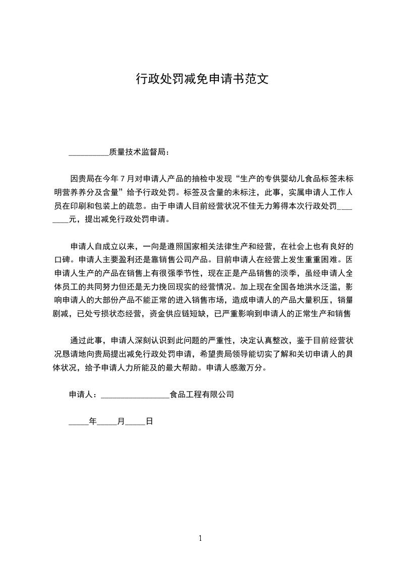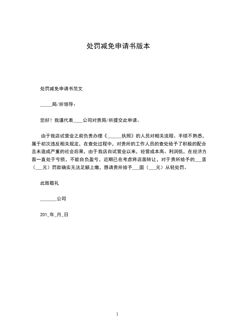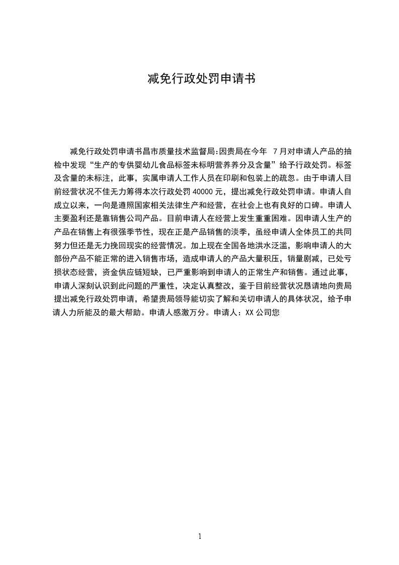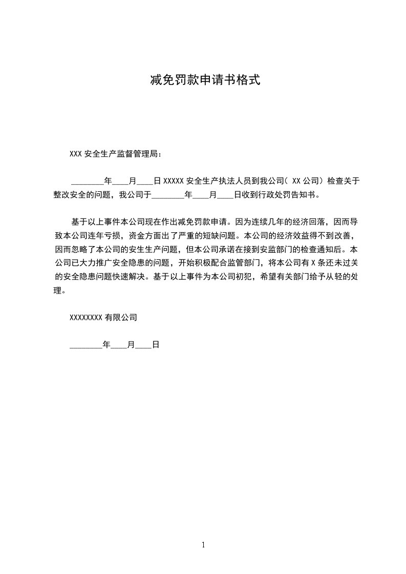 基于以上事件本公司现在作出减免罚款申请。因为连续几年的经济回落,因而导致本公司连年亏损,资金方面出了严重的短缺问题。本公司的经济效益得不到改善,因而忽略了本公司的安生生产问题,但本公司承诺在接到安监部门的检查通知后。本公司已大力推广安全隐患的问题,开始积极配合监管部门,将本公司有X条还未过关的安全隐患问题快速解决。基于以上事件为本公司初犯,希望有关部门给予从轻的处理。