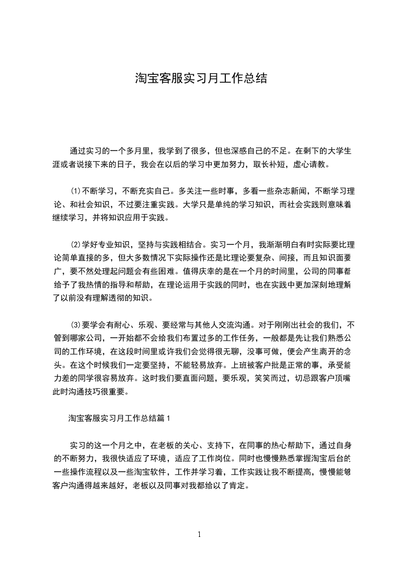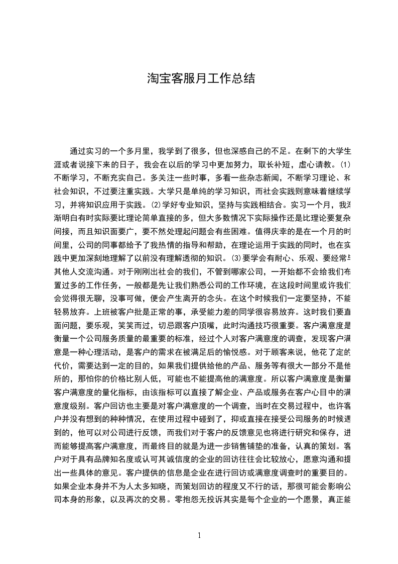 实习的这一个月之中,在老板的关心、支持下,在同事的热心帮助下,通过自身的不断努力,我很快适应了环境,适应了工作岗位。同时也慢慢熟悉掌握淘宝后台的一些操作流程以及一些淘宝软件,工作并学习着,工作实践让我不断提高,慢慢能够客户沟通得越来越好,老板以及同事对我都给以了肯定。