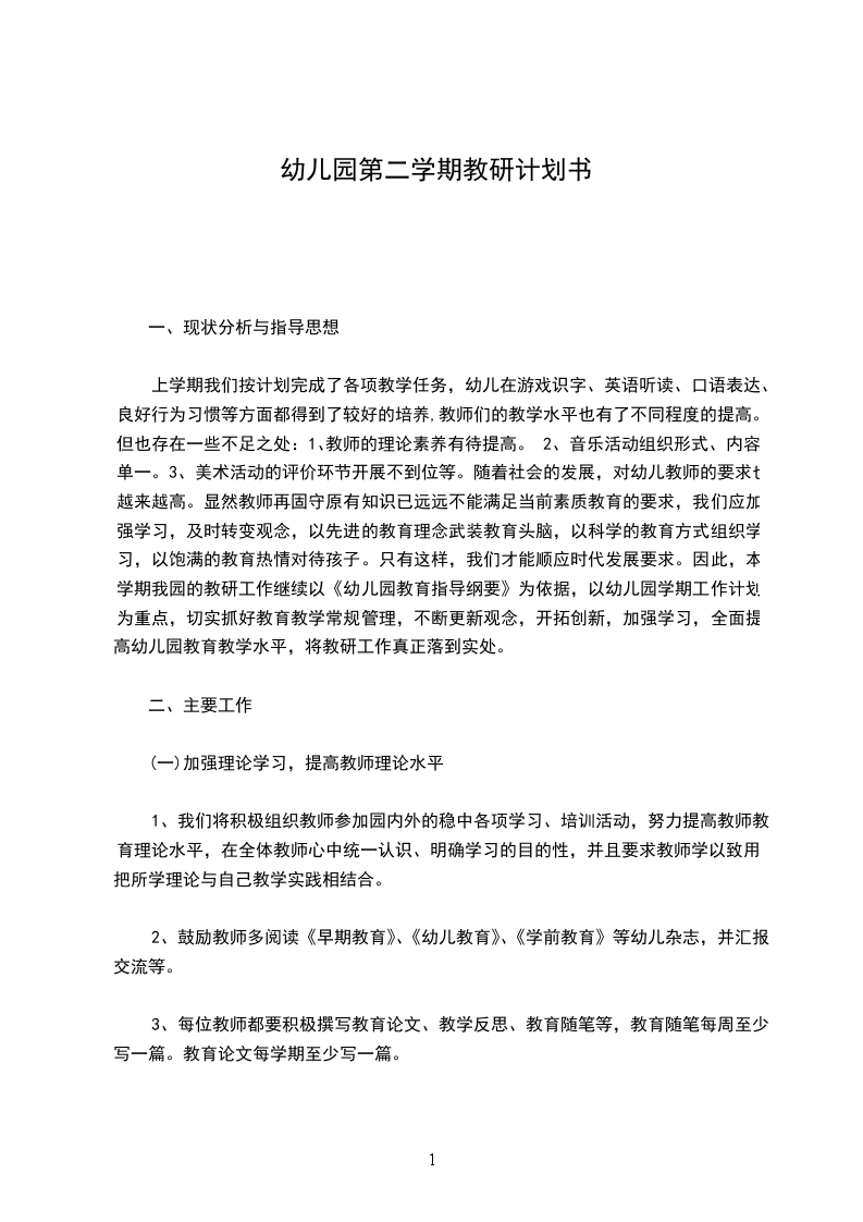 上学期我们按计划完成了各项教学任务,幼儿在游戏识字、英语听读、口语表达、良好行为习惯等方面都得到了较好的培养,教师们的教学水平也有了不同程度的提高。但也存在一些不足之处:1、教师的理论素养有待提高。2、音乐活动组织形式、内容单一。3、美术活动的评价环节开展不到位等。随着社会的发展,对幼儿教师的要求也越来越高。显然教师再固守原有知识已远远不能满足当前素质教育的要求,我们应加强学习,及时转变观念,以先进的教育理念武装教育头脑,以科学的教育方式组织学习,以饱满的教育热情对待孩子。只有这样,我们才能顺应时代发展要求。因此,本学期我园的教研工作继续以《幼儿园教育指导纲要》为依据,以幼儿园学期工作计划为重点,切实抓好教育教学常规管理,不断更新观念,开拓创新,加强学习,全面提高幼儿园教育教学水平,将教研工作真正落到实处。