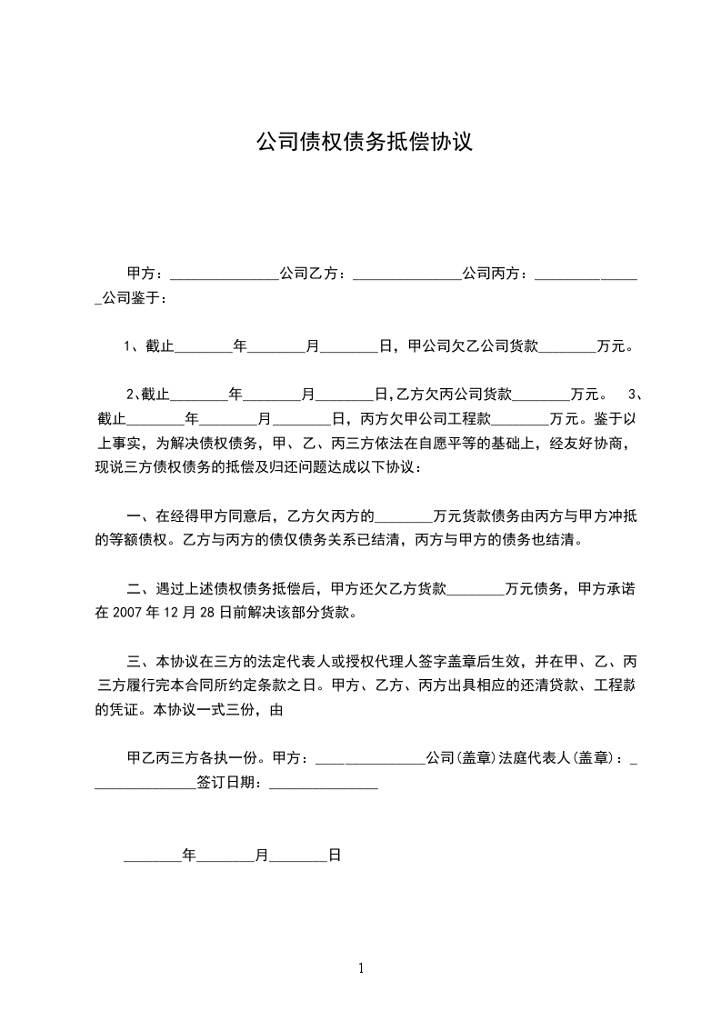 二、遇过上述债权债务抵偿后,甲方还欠乙方货款________万元债务,甲方承诺在2007年12月28日前解决该部分货款。