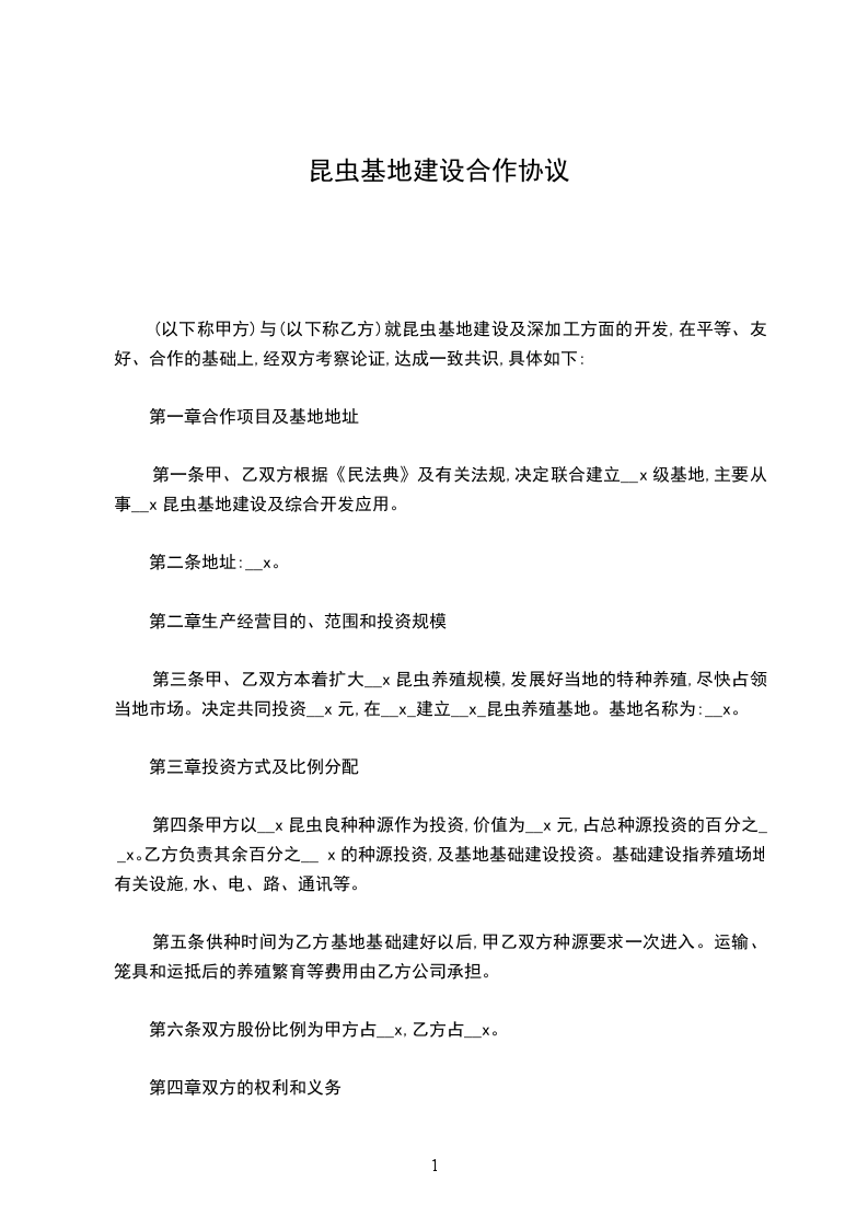 _________(以下称甲方)与_________(以下称乙方)就_________昆虫基地建设及深加工方面的开发,在平等、友好、合作的基础上,经双方考察论证,达成一致共识,具体如下: