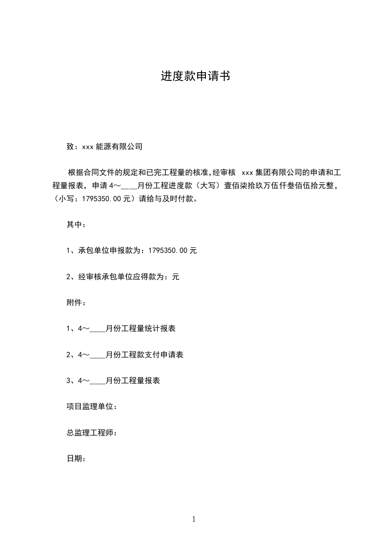 根据合同文件的规定和已完工程量的核准,经审核xxx集团有限公司的申请和工程量报表,申请4~____月份工程进度款(大写)壹佰柒拾玖万伍仟叁佰伍拾元整,(小写:1795350.00元)请给与及时付款。