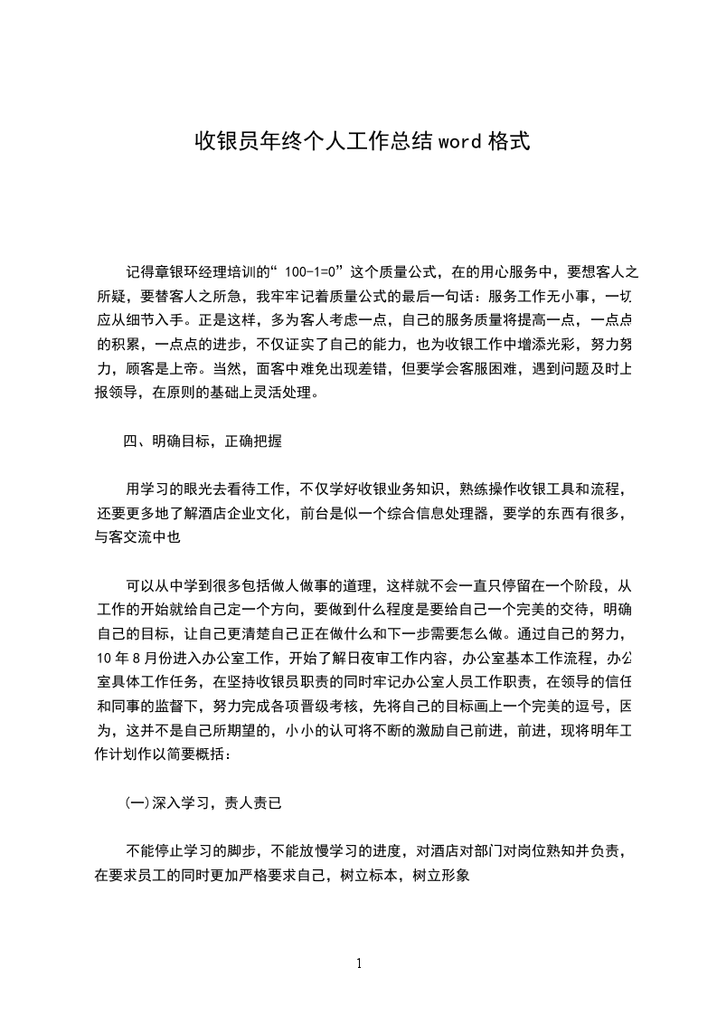 记得章银环经理培训的“100-1=0”这个质量公式,在的用心服务中,要想客人之所疑,要替客人之所急,我牢牢记着质量公式的最后一句话:服务工作无小事,一切应从细节入手。正是这样,多为客人考虑一点,自己的服务质量将提高一点,一点点的积累,一点点的进步,不仅证实了自己的能力,也为收银工作中增添光彩,努力努力,顾客是上帝。当然,面客中难免出现差错,但要学会客服困难,遇到问题及时上报领导,在原则的基础上灵活处理。