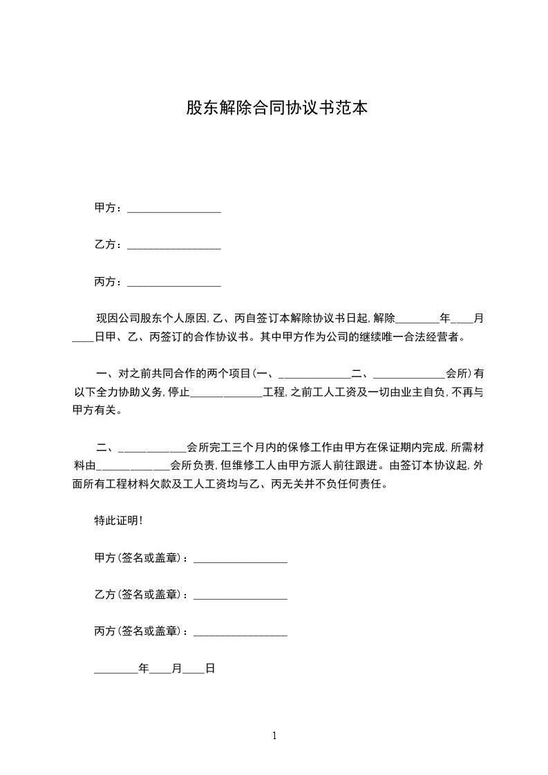 现因公司股东个人原因,乙、丙自签订本解除协议书日起,解除________年____月____日甲、乙、丙签订的合作协议书。其中甲方作为公司的继续唯一合法经营者。