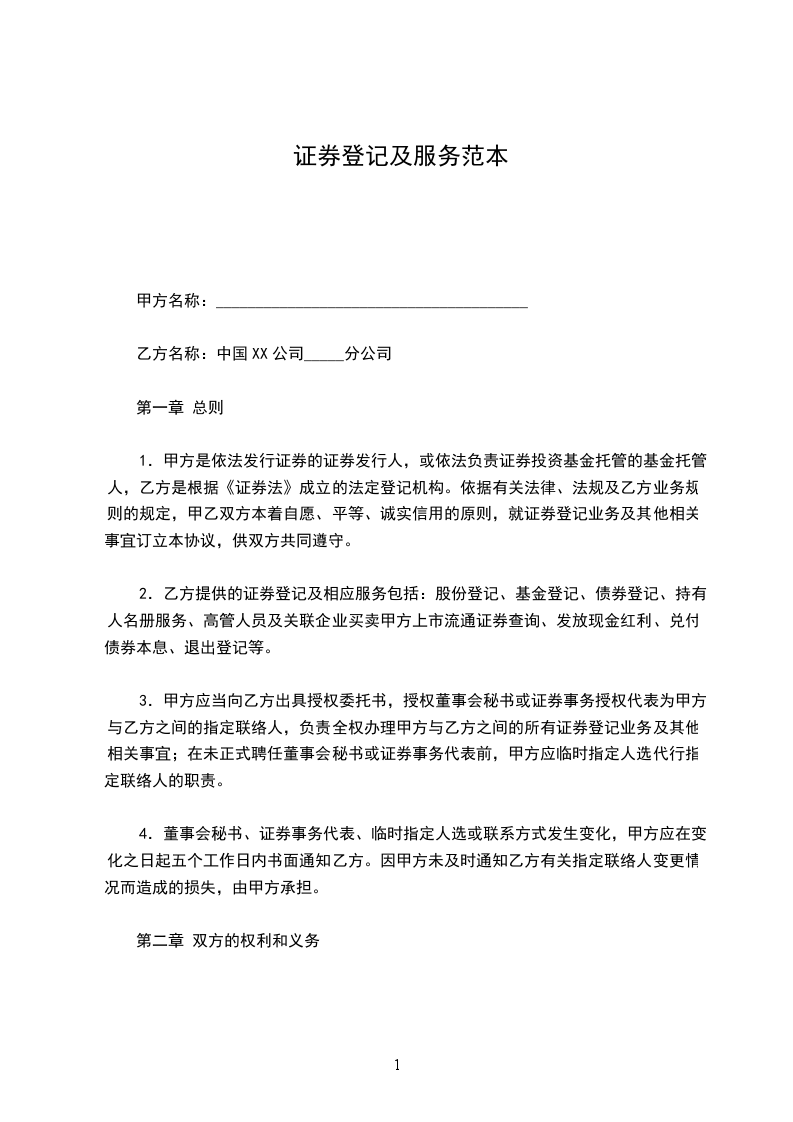 1.甲方是依法发行证券的证券发行人,或依法负责证券投资基金托管的基金托管人,乙方是根据《证券法》成立的法定登记机构。依据有关法律、法规及乙方业务规则的规定,甲乙双方本着自愿、平等、诚实信用的原则,就证券登记业务及其他相关事宜订立本协议,供双方共同遵守。
