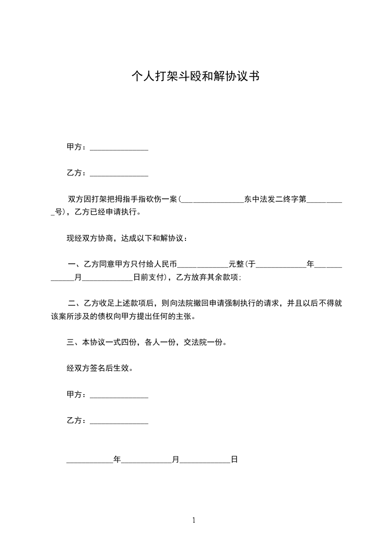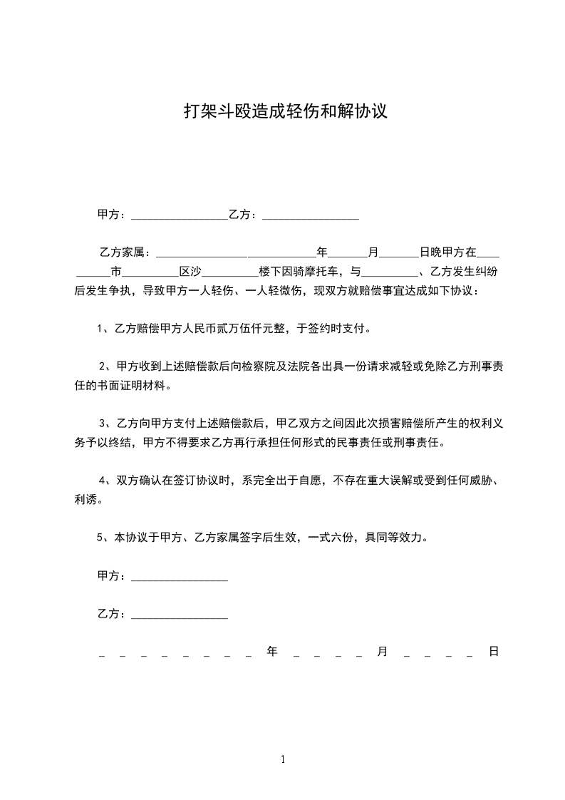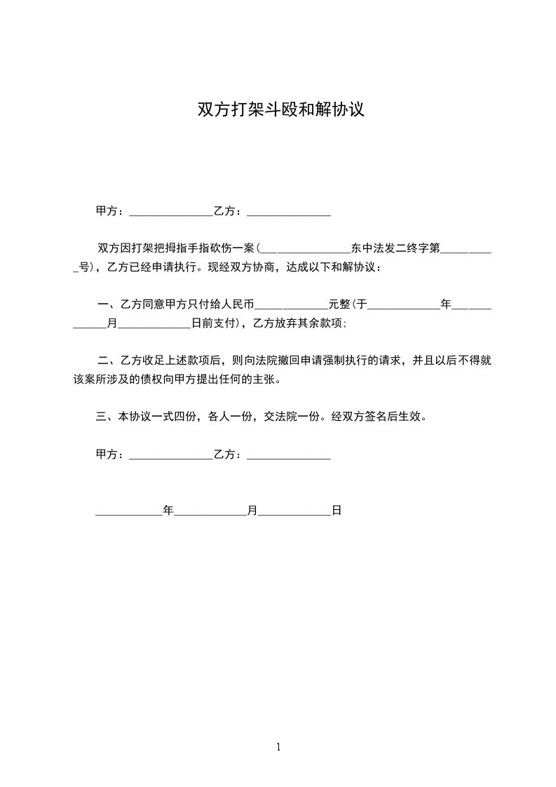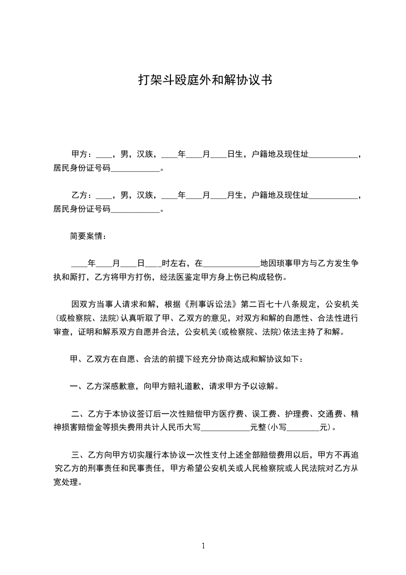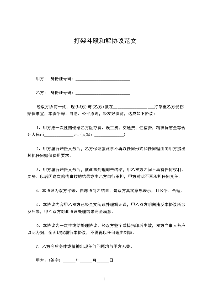 兹因甲、乙双方在施工过程中,双方发生打斗,现经双方协商一致,(甲方)与(乙方)在打架至乙方受伤赔偿事宜,本着平等、自愿、公平原则,经友好协商,达成如下协议: