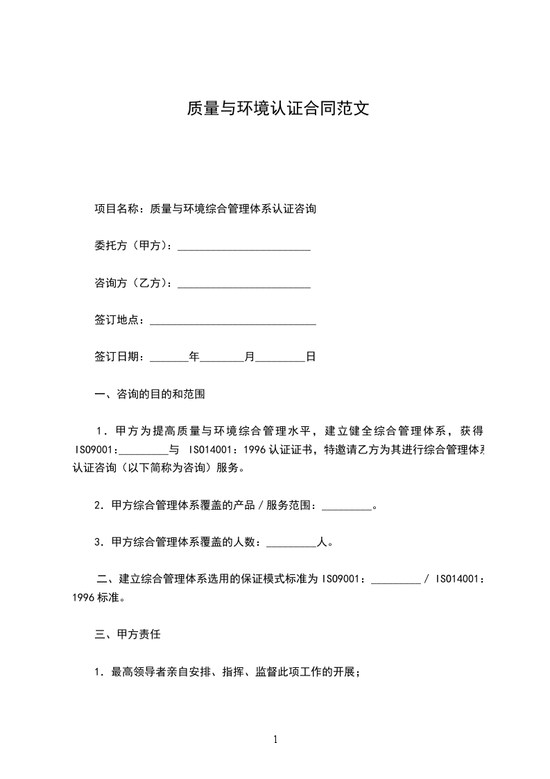 1.履行期限:_________年_________月_________日至甲方通过综合管理体系认证时结束。