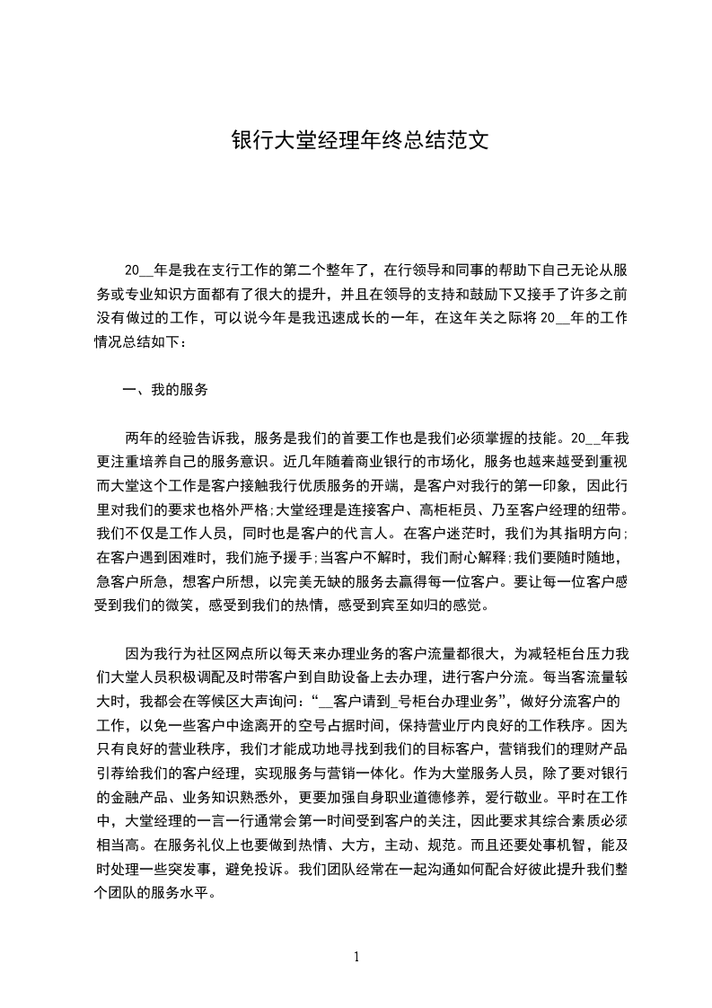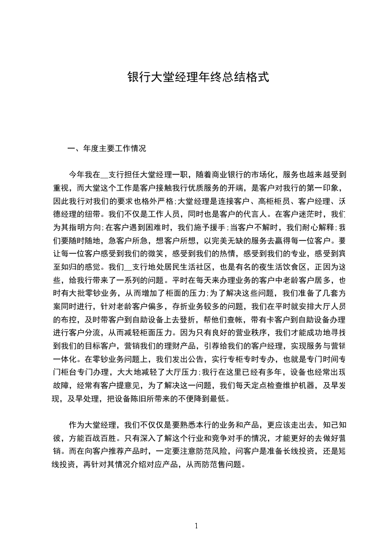 在过去的一年中,我在大堂经理这个岗位上学习到了许多与客户交流的经验和一些营销的技巧,但也存在许多的不足之处。在今年的第三季度神秘人检查中,我行得分倒数第三,给分、支行抹了黑。之后我们痛定思痛,分析了失分的原因,主要是外部环境,和一些细节上出现了问题,针对这些问题,我们在平时积极培训,通过我们的努力,终在第四季度受到了分行行为规范小组的通报表扬。我相信,只有踏踏实实,默默无闻的耕耘,才能结出丰硕的果实。明年我行又面临着搬迁的工作。建议分行在此位置还应保留自助设备服务区,从而来避免客户的流失。