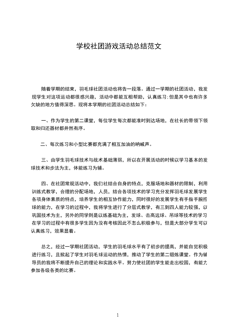 随着学期的结束,羽毛球社团活动也将告一段落。通过一学期的社团活动,我发现学生对这项运动都很感兴趣,活动中都能互相帮助,认真练习;但是其中也有许多欠缺的地方值得深思。现将本学期的社团活动总结如下: