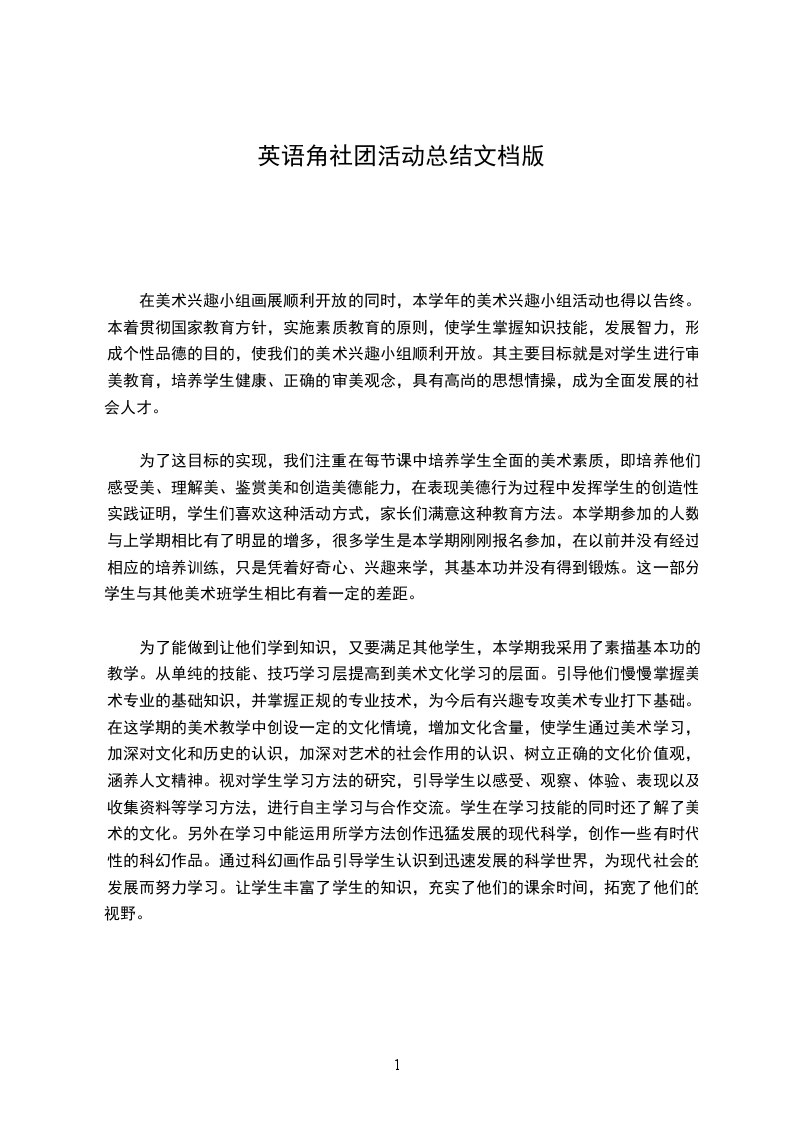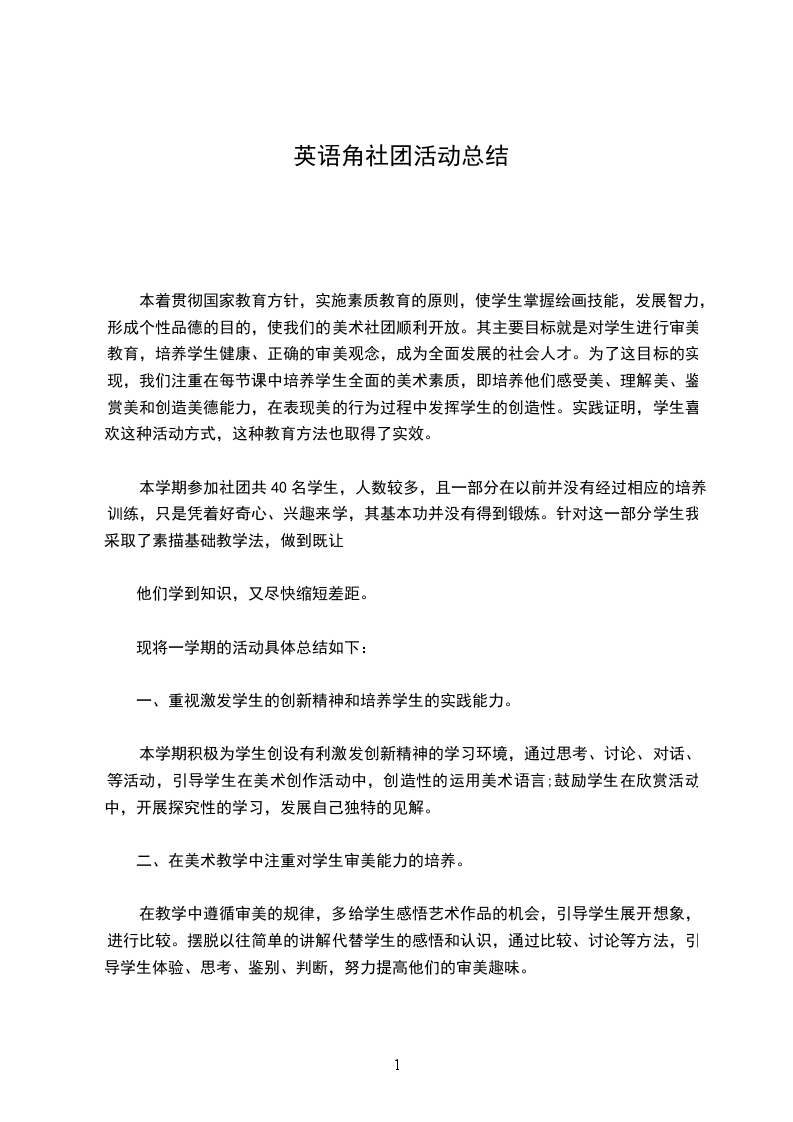本着贯彻国家教育方针,实施素质教育的原则,使学生掌握绘画技能,发展智力,形成个性品德的目的,使我们的美术社团顺利开放。其主要目标就是对学生进行审美教育,培养学生健康、正确的审美观念,成为全面发展的社会人才。为了这目标的实现,我们注重在每节课中培养学生全面的美术素质,即培养他们感受美、理解美、鉴赏美和创造美德能力,在表现美的行为过程中发挥学生的创造性。实践证明,学生喜欢这种活动方式,这种教育方法也取得了实效。