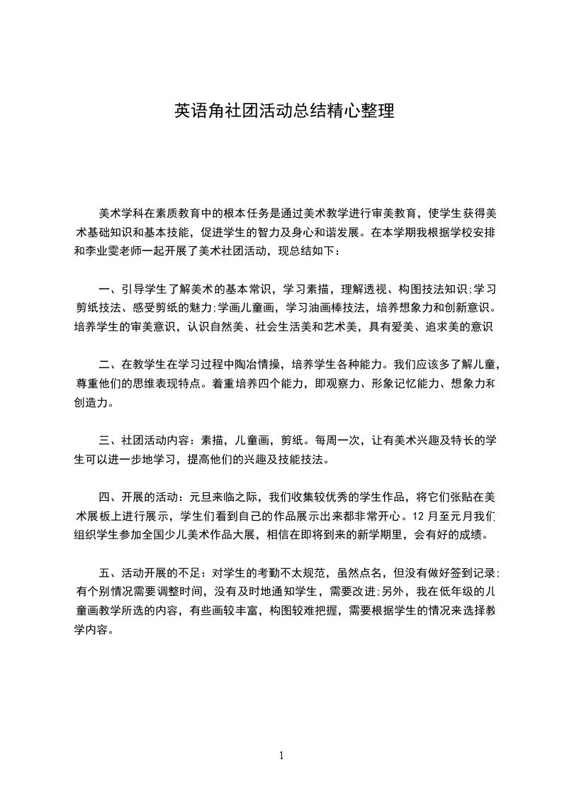 本学期社团收获是可喜的,___三位学生荣获校第六届艺术节比赛绘画类一等奖,孙成豪等15位学生分别荣获二、三等奖,___还获得瑞安市科幻画比赛一等奖并参加温州市比赛等等。当然,社团活动还存在诸多的不足,今后我会努力完善。
